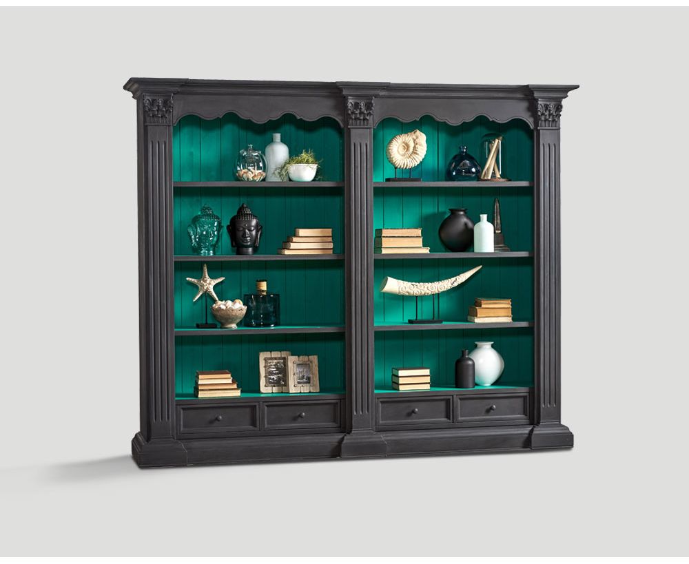 Libreria 4 cassetti, in legno laccato e cerato a pennello color Lavagna, interni finitura Verde Smeraldo