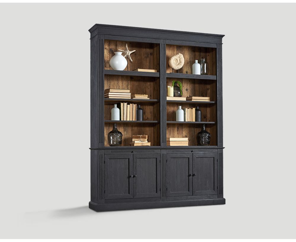 Libreria in legno vecchio riciclato con interno finitura Naturale, esterno laccato e cerato a pennello color Lavagna. Elemento 4 porte