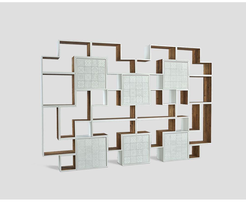 Libreria componibile, struttura in legno vecchio riciclato, interno finitura naturale, esterni disponibili in 7 colori: giallo, blu avion, rosso, bianco, lavagna, verde smeraldo, verde bosco e old pine.