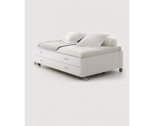 Кровать - трансформер кровать TRAVEL STUDIO. Эта передвижная кровать на колесиках была создана, чтобы удовлетворить все потребности, связанные с отсутствием больших пространств в небольших квартирах. Кровать доступна в белой или алюминиевой ребристой отделке, и установлена на колесики для легкого перемещения. Она предлагается в двух размерах. И может быть оснащена дополнительной кроватью или выдвижными ящиками для хранения вещей. Ножки появляются автоматически при поднятии матраса, в результате чего оба матрасы получаются на одном уровне.
