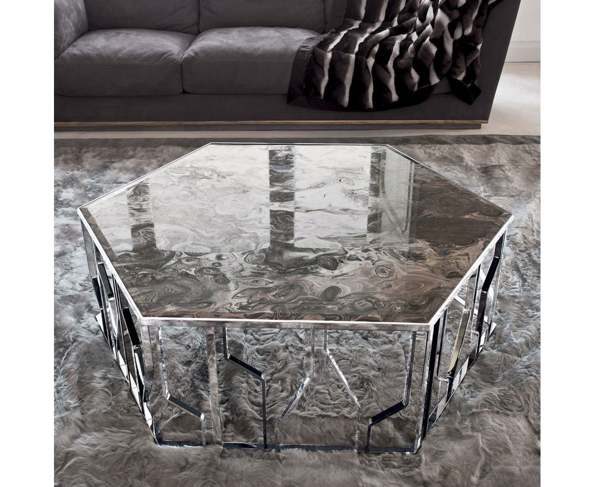 Современный журнальный столик с основанием из металла. Столешница в виде шестигранника предлагается в нескольких вариантах отделки, поэтому легко подобрать модель именно для себя. она может быть выполнена из мрамора или стекла с зеркальной поверхностью. Столик обладает не только функционалом, но и красотой, привлекающей внимание.