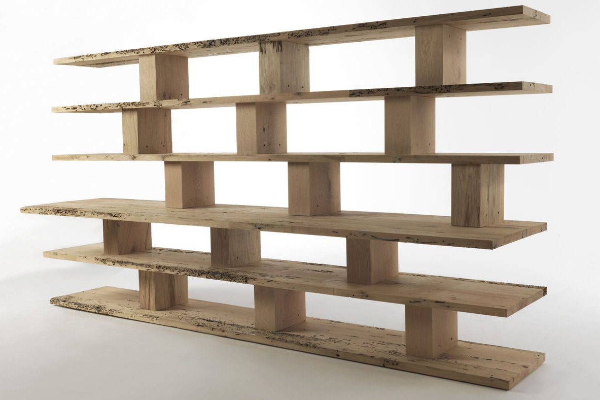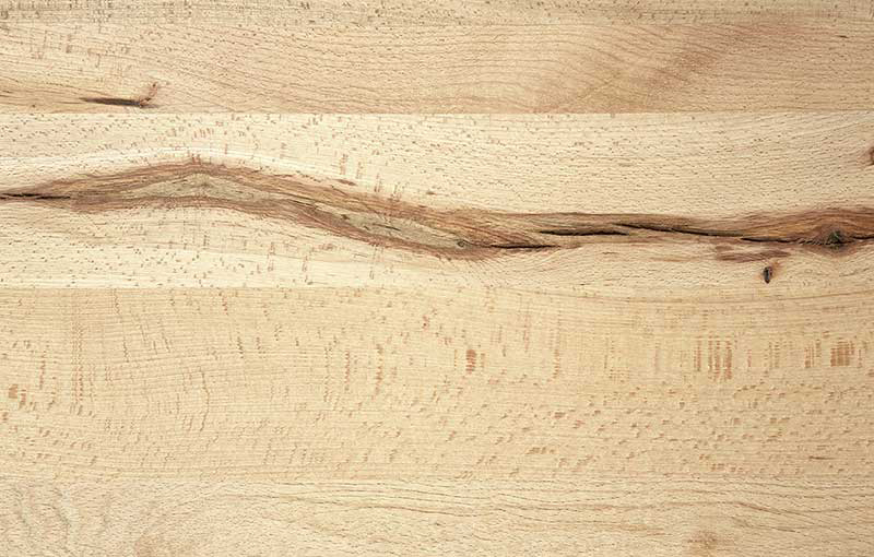 «Мы используем каркасы из сердца букового ствола с частично усеченными сердцевинами. Эти открытые сердцевины, которые трескаются во время сушки, с их коричневыми краями и переплетенными сучками, доминируют в характере этого уникального типа древесины. Буковый сердечник - лиственная древесина с тенденцией к легкой деформации, даже после того, как она была обработана профессионально. Поверхности остаются относительно стабильными по цвету, но могут иметь более желтый оттенок в зависимости от интенсивности света».
