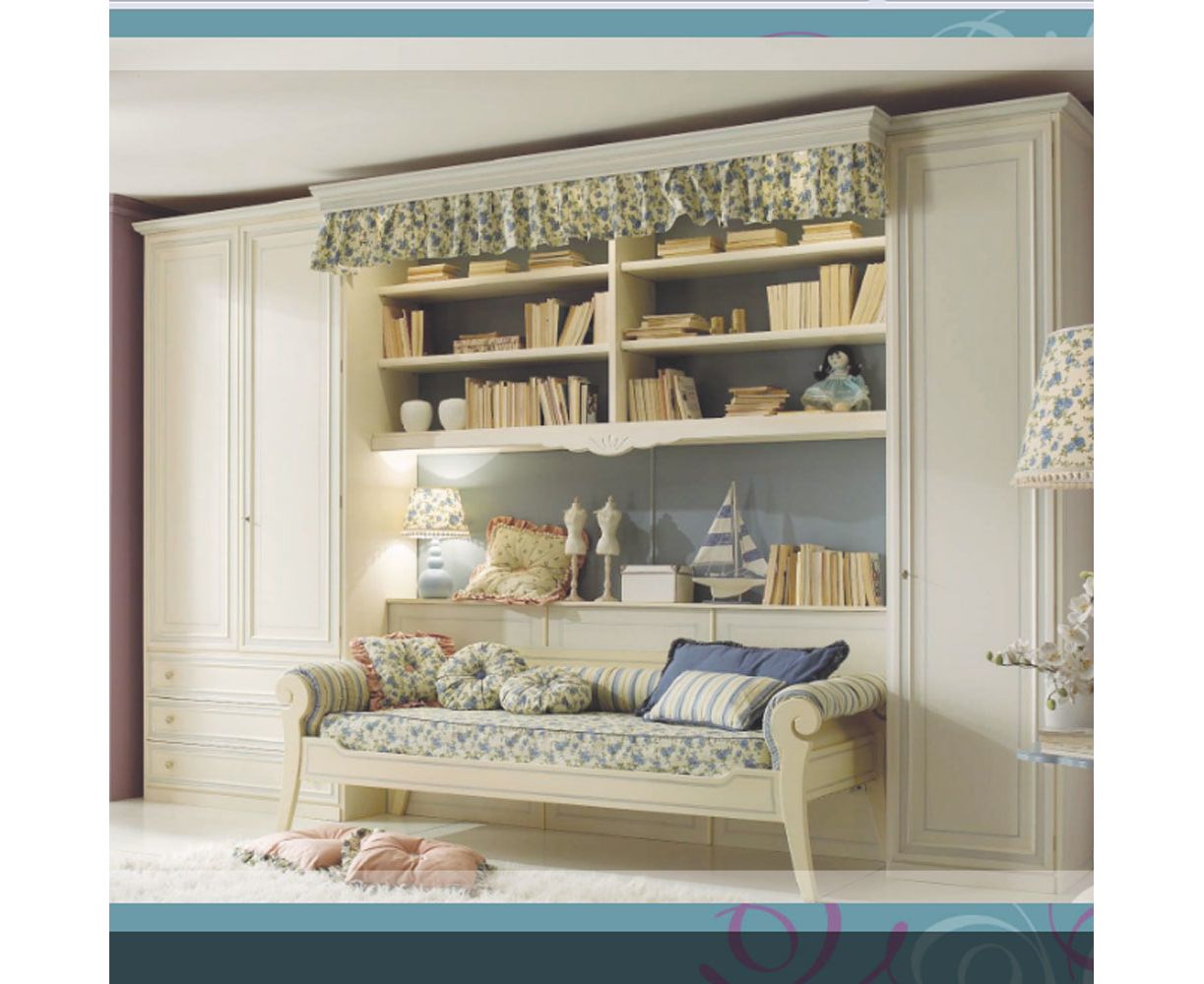 Нежный, элегантный и красивый гарнитур в приятных пастельных тонах. Отличное решение для оформления спальни для мальчиков или девочек. В гарнитур входят: диван-кровать, система шкафов с открытыми и закрытыми полками. Все предметы мебели выполнены в классическом стиле. Каркас из натуральной древесины в отделке из нетоксичных материалов.