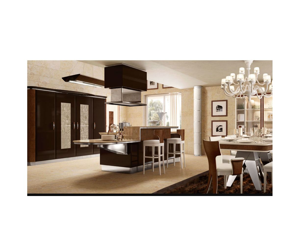 Шикарный мебельный гарнитур для кухни в современном стиле. В гарнитур входят: стеновая композиция (колонны, терминалы), стол с деревянным топом, стулья с или без подлокотников, витрина 4 створки с ящиками, барный табурет.