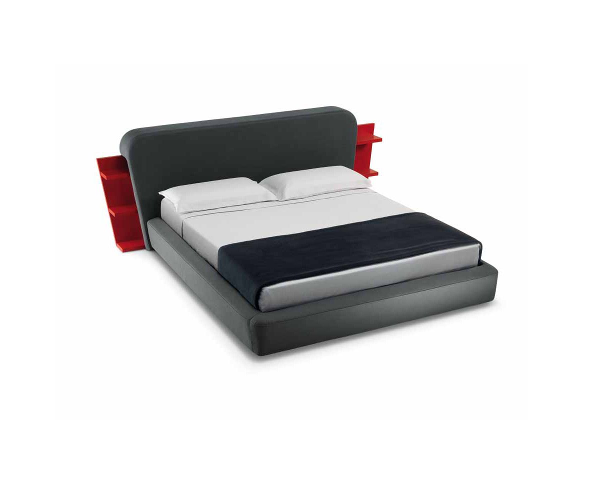 Двуспальная кровать на каркасе, полностью скрытом за обивкой. Невысокое мягкое изголовье с закругленными углами. По бокам сделаны небольшие открытые полки контрастного цвета.