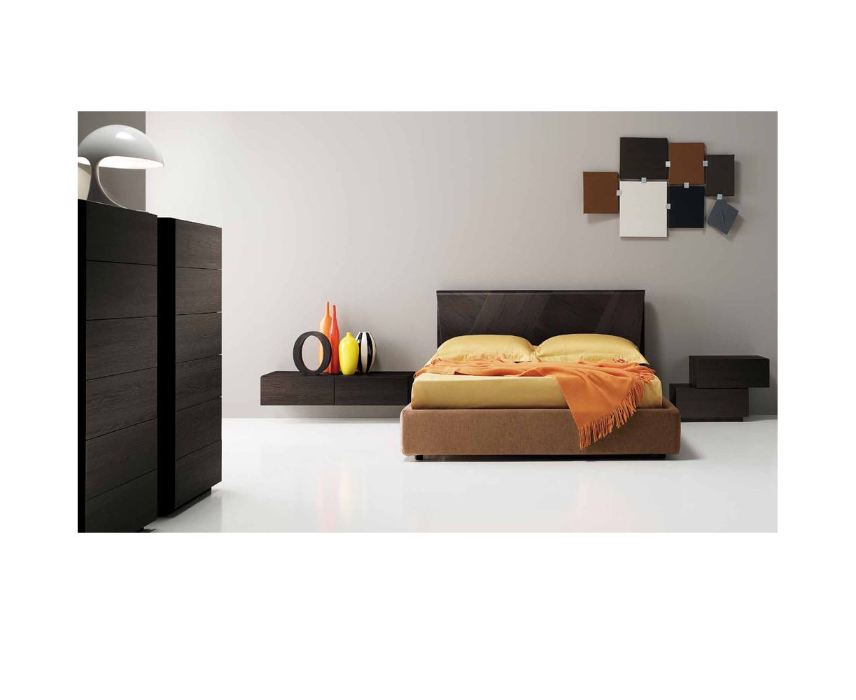Мебельный гарнитур для спальни CORA включает в себя несколько тумбочек, комод с выдвижными полками, двуспальную кровать в обивке из искусственной кожи.