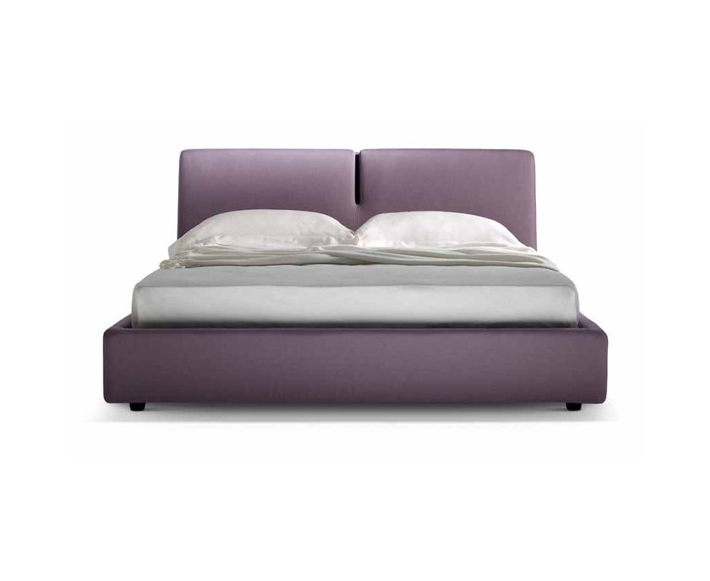 Двуспальная кровать с каркасом, полностью скрытым под обивкой. Невысокое изголовье разделено по середине.