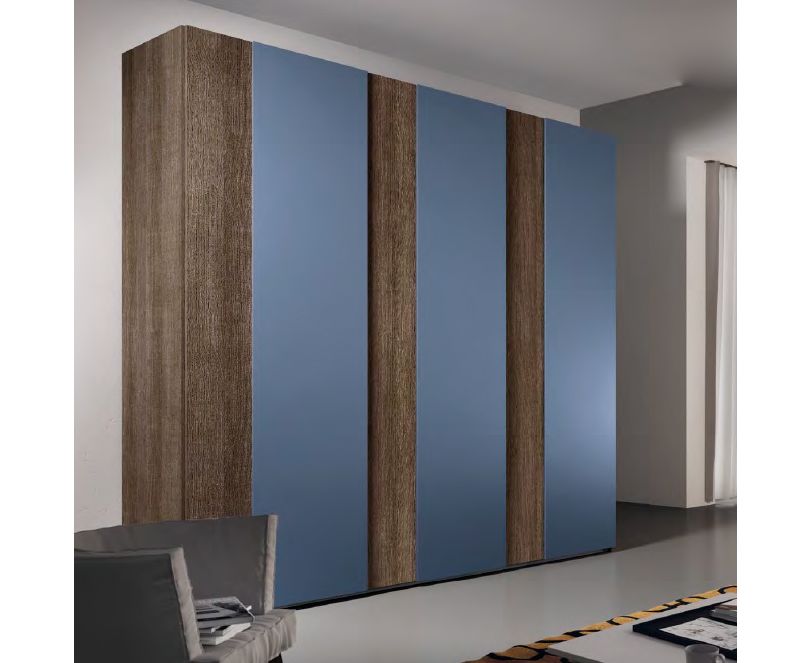Шкаф с 6-ю дверцами. Две толщины. Выступающие дверцы окрашены в матовый глубинно-синий (RAL 5014). Остальные части - дуб.