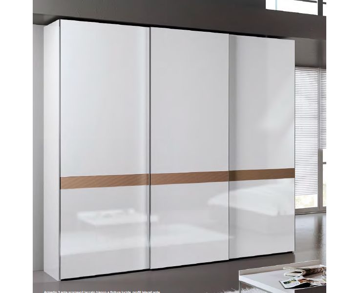 Шкаф-купе с 3-мя раздвижными дверцами покрытыми белым лаком. По горизонтали проходит полоса из стекла бронзового оттенка.