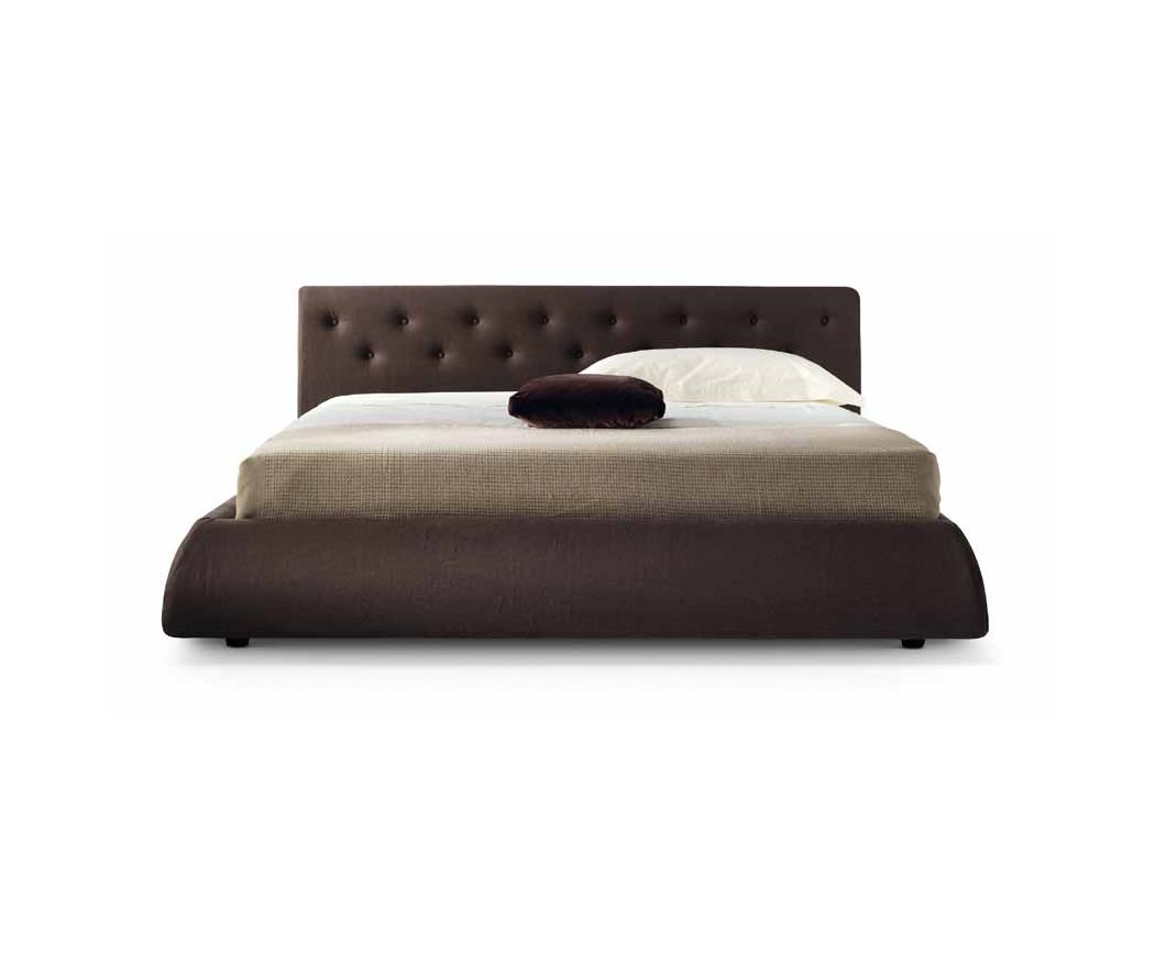 Двуспальная кровать с каркасом, полностью скрытым под обивкой. Невысокое изголовье украшено декоративными пуговицами. В основании имеется вместительный отсек для хранения вещей.