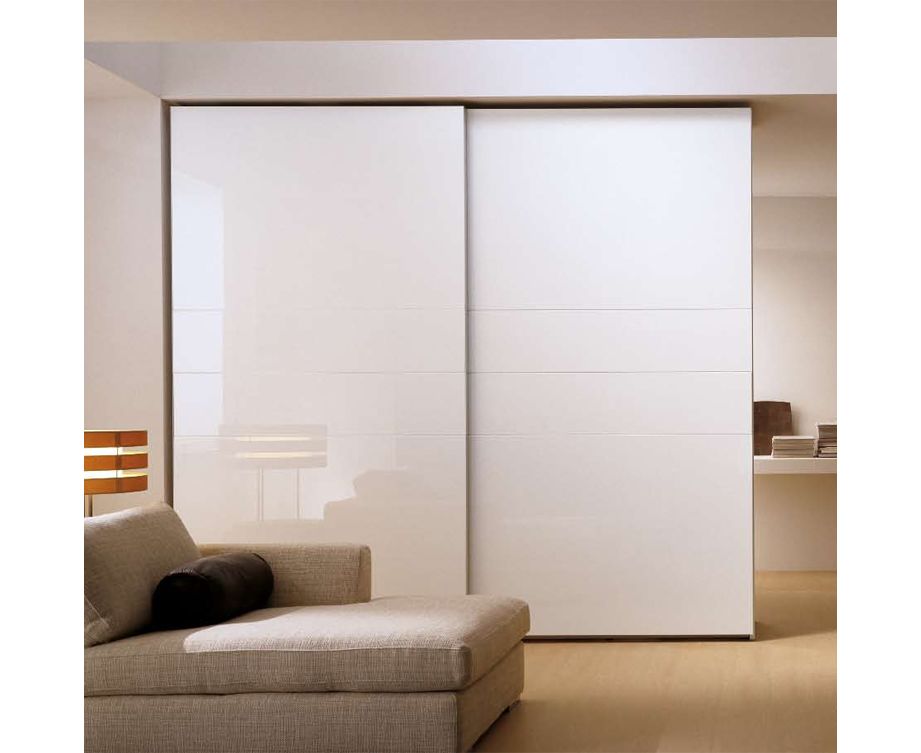 Шкаф с двумя раздвижными дверями в отделке глянцевый белый лак. Профиль из алюминия.