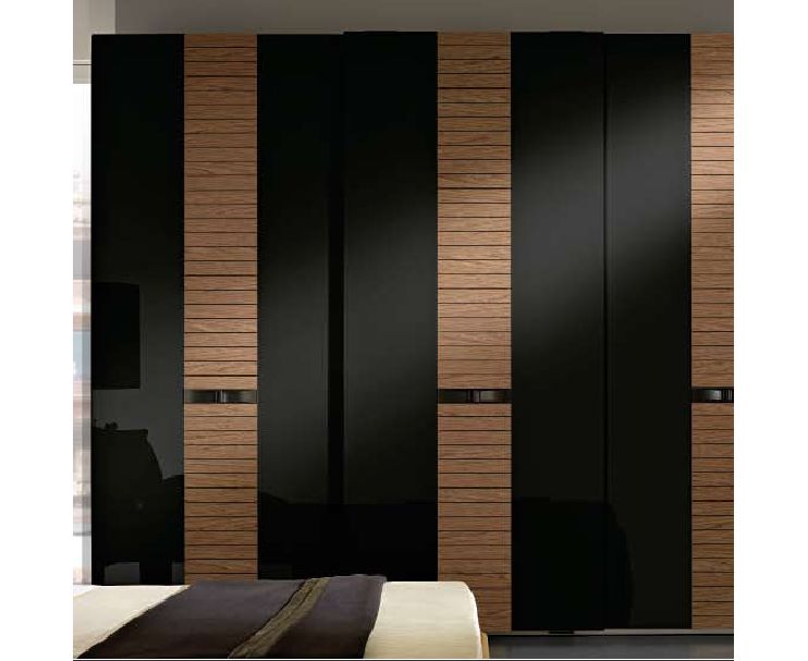 Шкаф с тремя раздвижными дверцами. Боковые панели с черным лакированным глянцевым покрытием, центральные - шпонированные панели орехового оттенка.