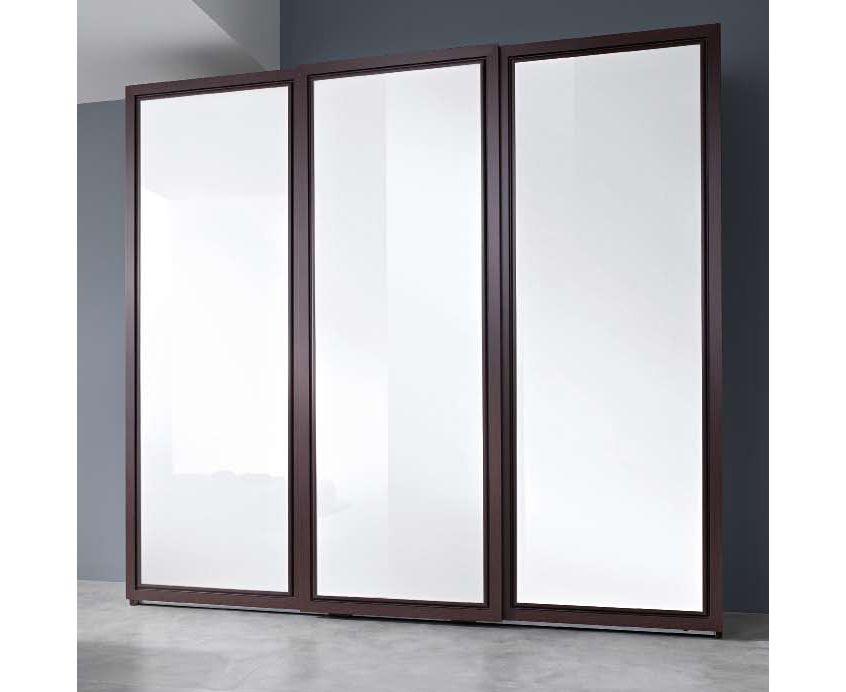Шкаф с тремя раздвижными дверцами с центаральной частью в глянцевом белом цвете и рамой, шпонированной дубом.