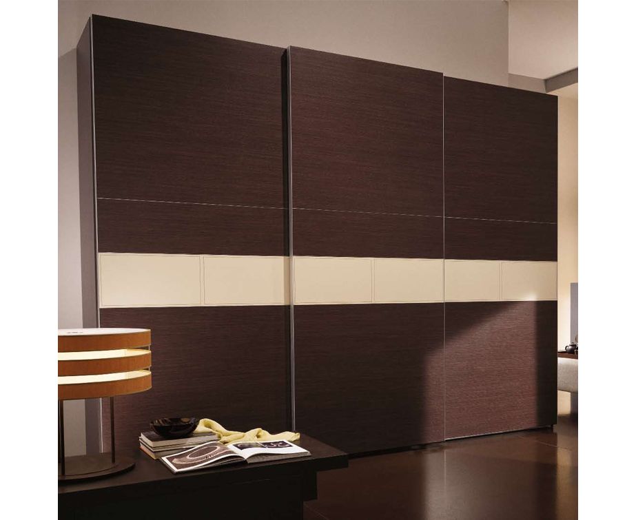 Шкаф с тремя раздвижными облицованными шпоном дуба в цвете мокко и горизонтальной вставкой из кожи кремового цвета.