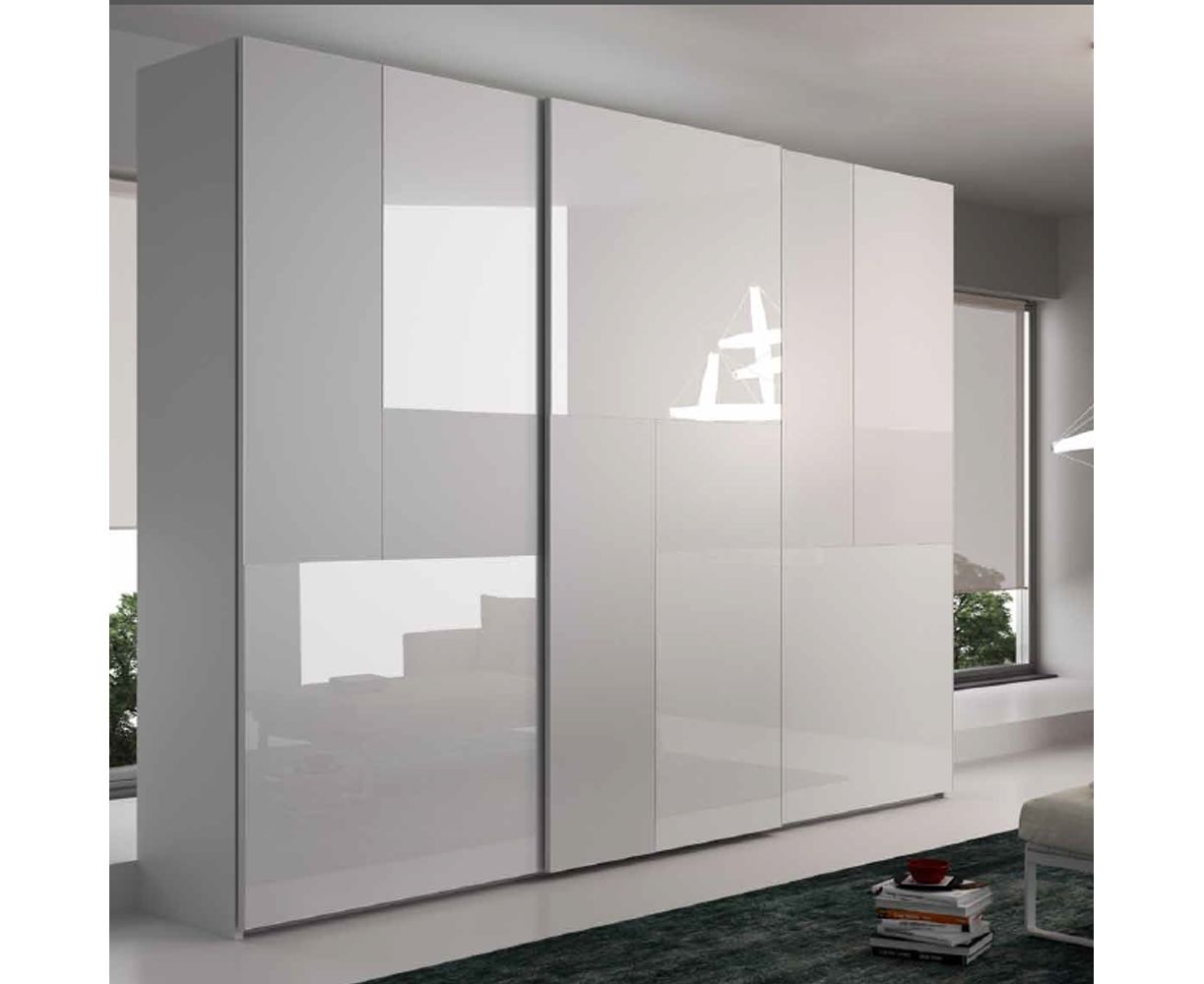 Шкаф-купе с тремя белыми глянцевыми дверцами с белым остеклением.