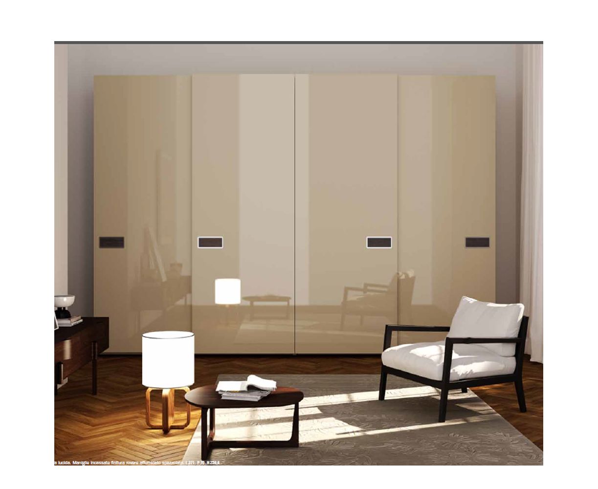 Шкаф-купе с четырьмя лакировнными глянцевыми дверцами. Утопленные ручки.