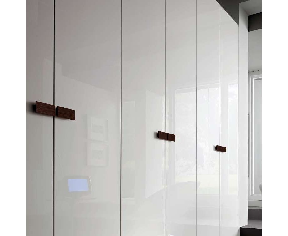 Шкаф-купе с 6-ю дверцами. Горизонтальные ручки в отделке мокко дуб. Дверцы с лакированным покрытием белого цвета.