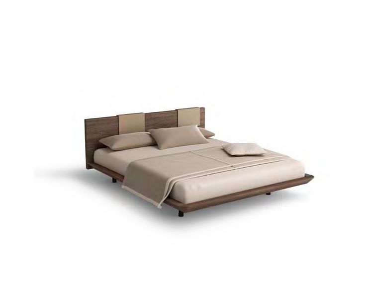 Двуспальная кровать с деревянным каркасом. Невысокое изголовье.