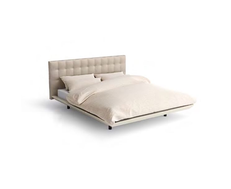 Двуспальная кровать с деревянным каркасом. Невысокое изголовье украшено стежкой капитоне.