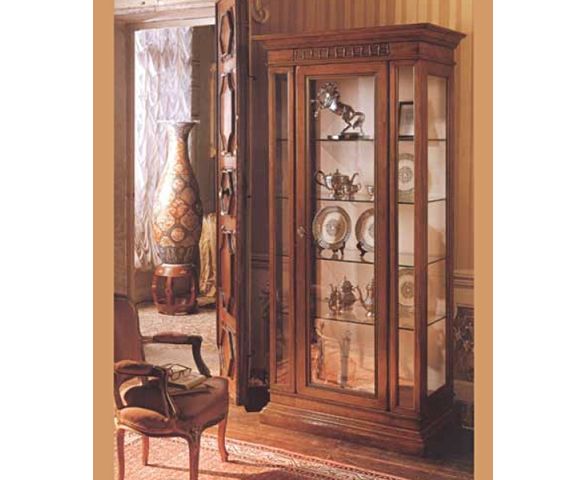 Классическая витрина, выполненная из натурального дерева. Модель имеет несколько полок, закрываемых стеклянными дверцами. Мебель украшена резными элементами.
