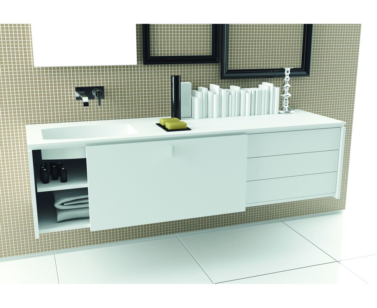 Настенный шкаф. Одна широкая раздвижная дверца, скрывающая две полки, три выдвижных ящика. Предлагаются различные конфигурации и размеры. К шкафу отлично подойдет раковина Planar module.