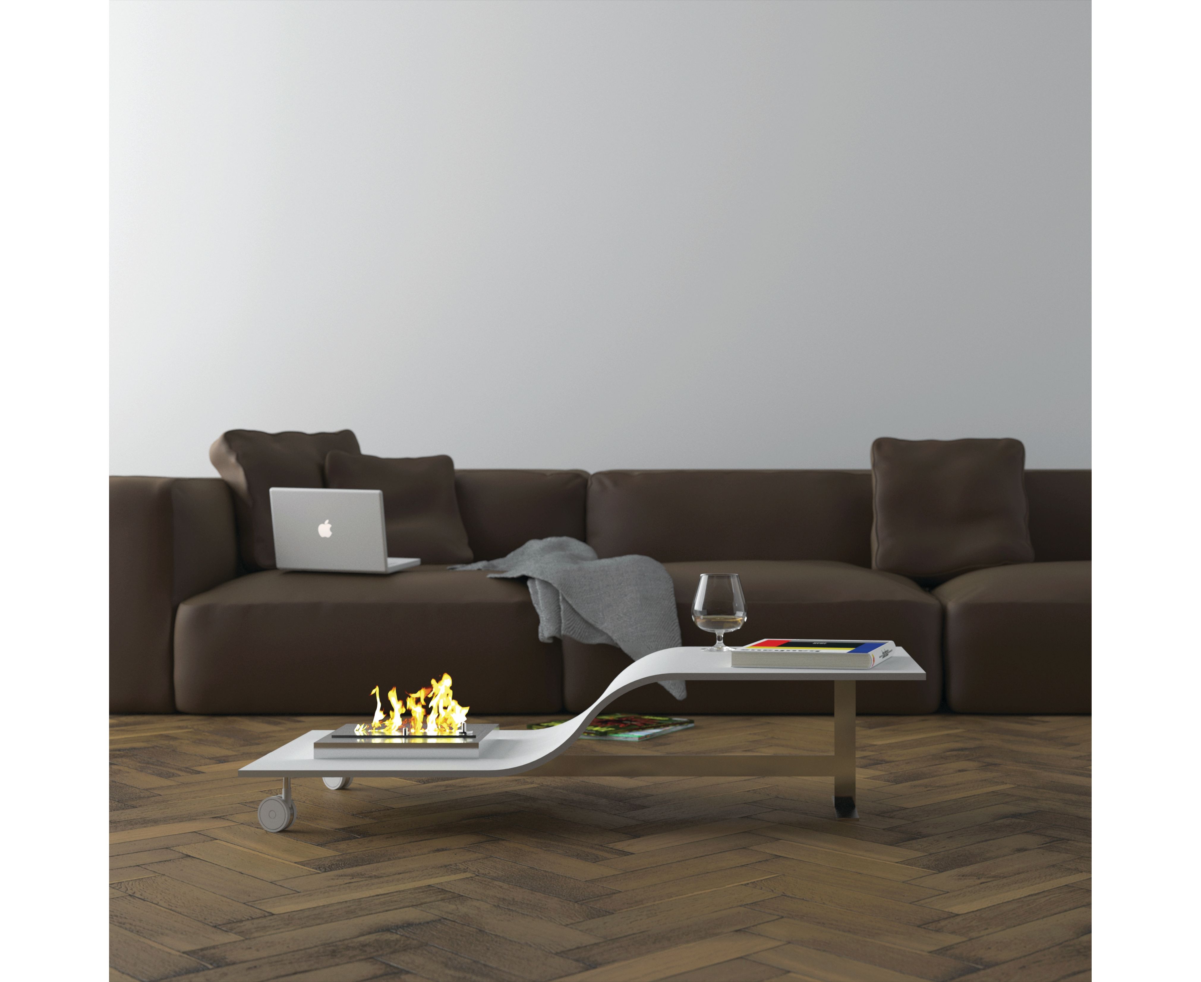 Напольный биокамин, открытый со всех сторон. Очаг совмещен с журнальным столиком. Защитное стекло по требованию.