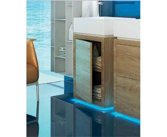 Мебель для ванной комнаты Wood Tower включает в себя тумбу, представленную в трех вариантах: без полок, с двумя полками или с двумя выдвижными ящиками; и раковину квадратной формы.