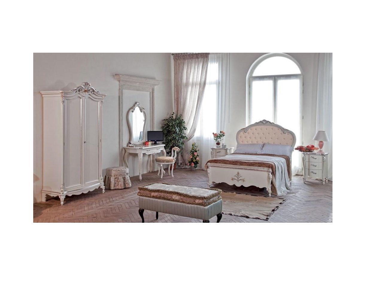 Мебельный гарнитур для спальни, выполненный в классическом стиле. В этих моделе присутствует сдержанность, нет переизбытка роскошных декоративных элементов, все изысканно и элегантно. В гарнитур входят: двуспальная кровать, прикроватная тумбочка, консоль, зеркало, шкаф, банкетка и стул.