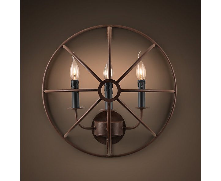 Настенный светильник Foucault's Iron Orb Sconce Rustic Iron фабрики Restoration Hardware. Модель выполнена в виде ажурного полуглобуса, имитирующего вращение земли. Под каждой лампочкой классический подсвечник, отделка из железа под ржавчину создают эффект деревенского стиля.