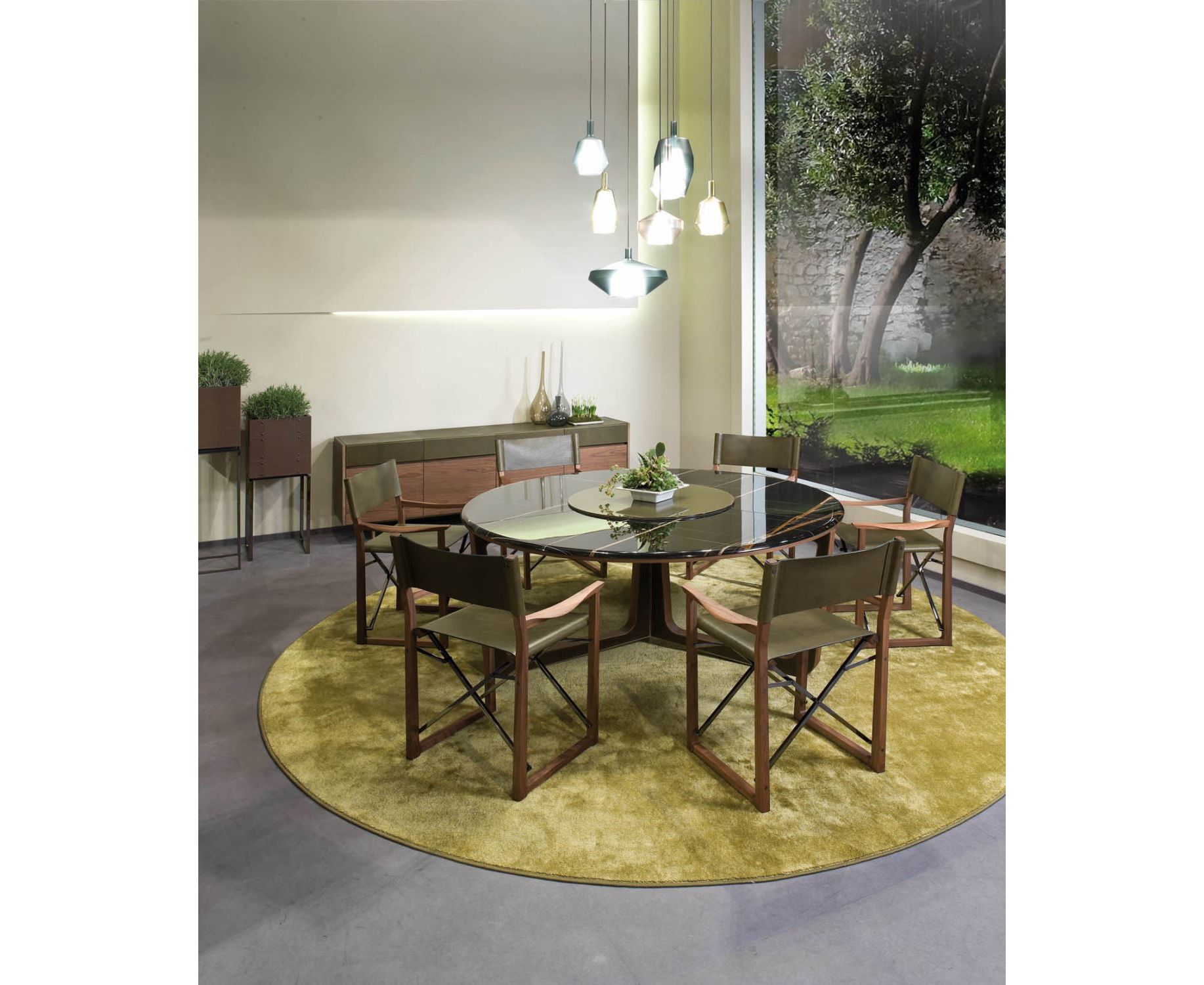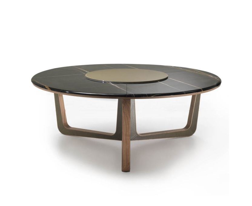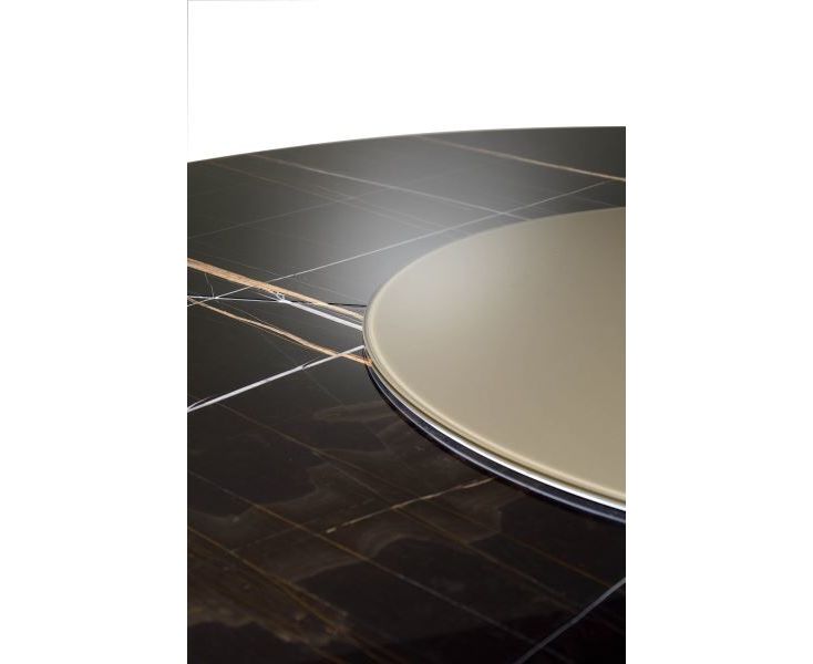 Ascot отвечает современным потребностям с классическим подходом. Изготовлен из ценных материалов и имеет необходимую форму. На котором даже целесообразно почти незаменимо, как «ленивая Сьюзан», окрашенная стеклянная столешница, прикрепленная к центру, позволяет всем гостям получить доступ к еде, может охарактеризовать модель нежным способом. Топ с диаметром 150 см и 180 см, доступен в черном дереве грецкого ореха со сшитым шпоном или мрамором; с исключительностью нового предложения в мраморе Sahara Noir, с глянцевым полиэфирным покрытием. Основание состоит из трех больших ножек, расположенных под углом 120 градусов друг относительно друга, в сплошном черном дереве грецкого ореха с боком, покрытой седловой кожей.