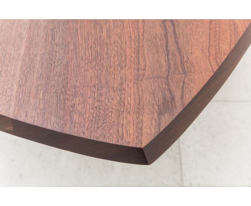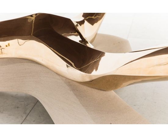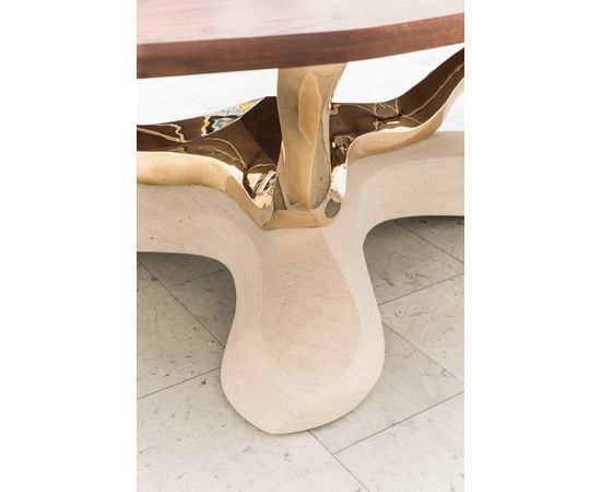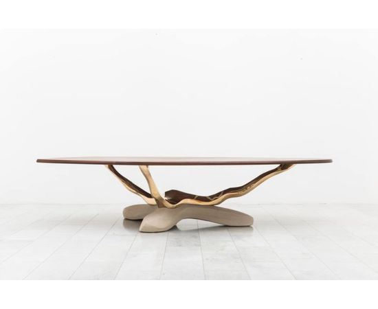 Единственный в своем роде 366 см обеденный стол ручной работы Маркуса Хаасе украшен скульптурной столешницей из черного американского ореха, покоящейся на бронзовой треноге, поддерживаемой резным основанием из известняка. Основание треноги стола, отлитое из полированной бронзы, выглядит как оживленные волны или столбы дыма. Мягкое основание из известняка с ручной резьбой, контрастирующее с сиянием полированной до зеркальной бронзы бронзы штатива, идеально гармонирует со столом.