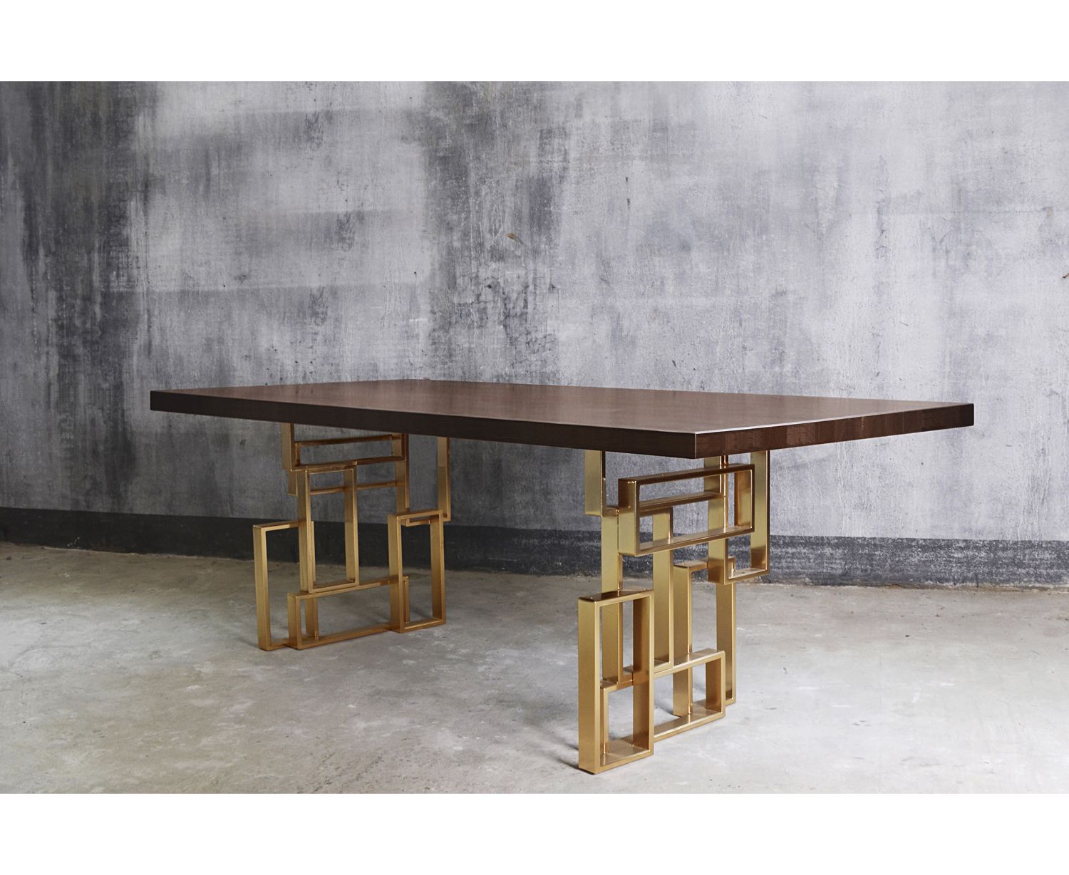 Оригинальный обеденный стол, выполненный в современном стиле. Столешница сделана из лакированного дерева. Данная модель стоит на двух больших ножках, состоящих из прямоугольников разной длины и ширины. Доступны разные цвета и размеры.