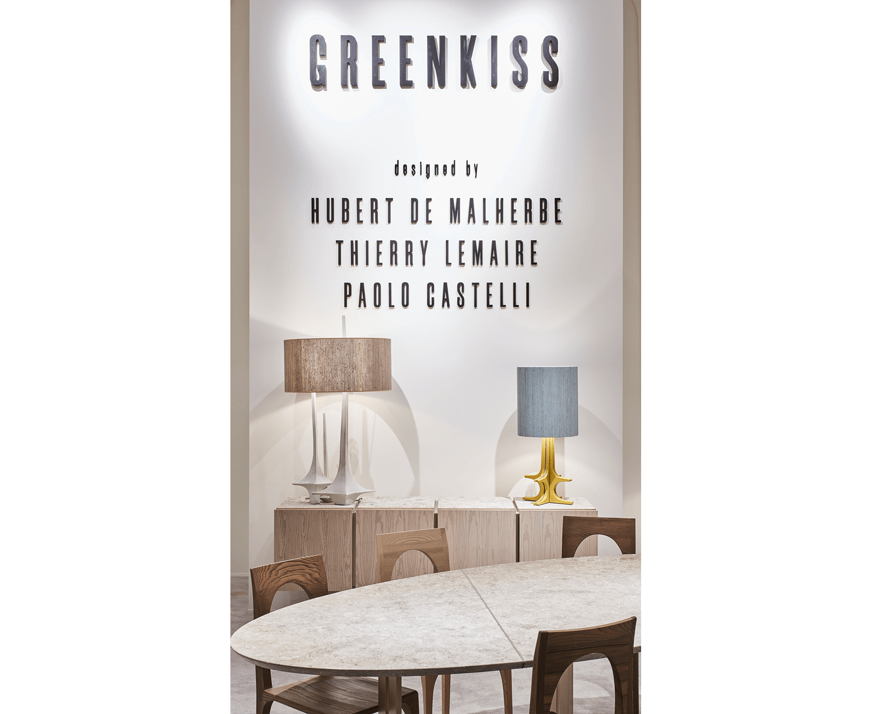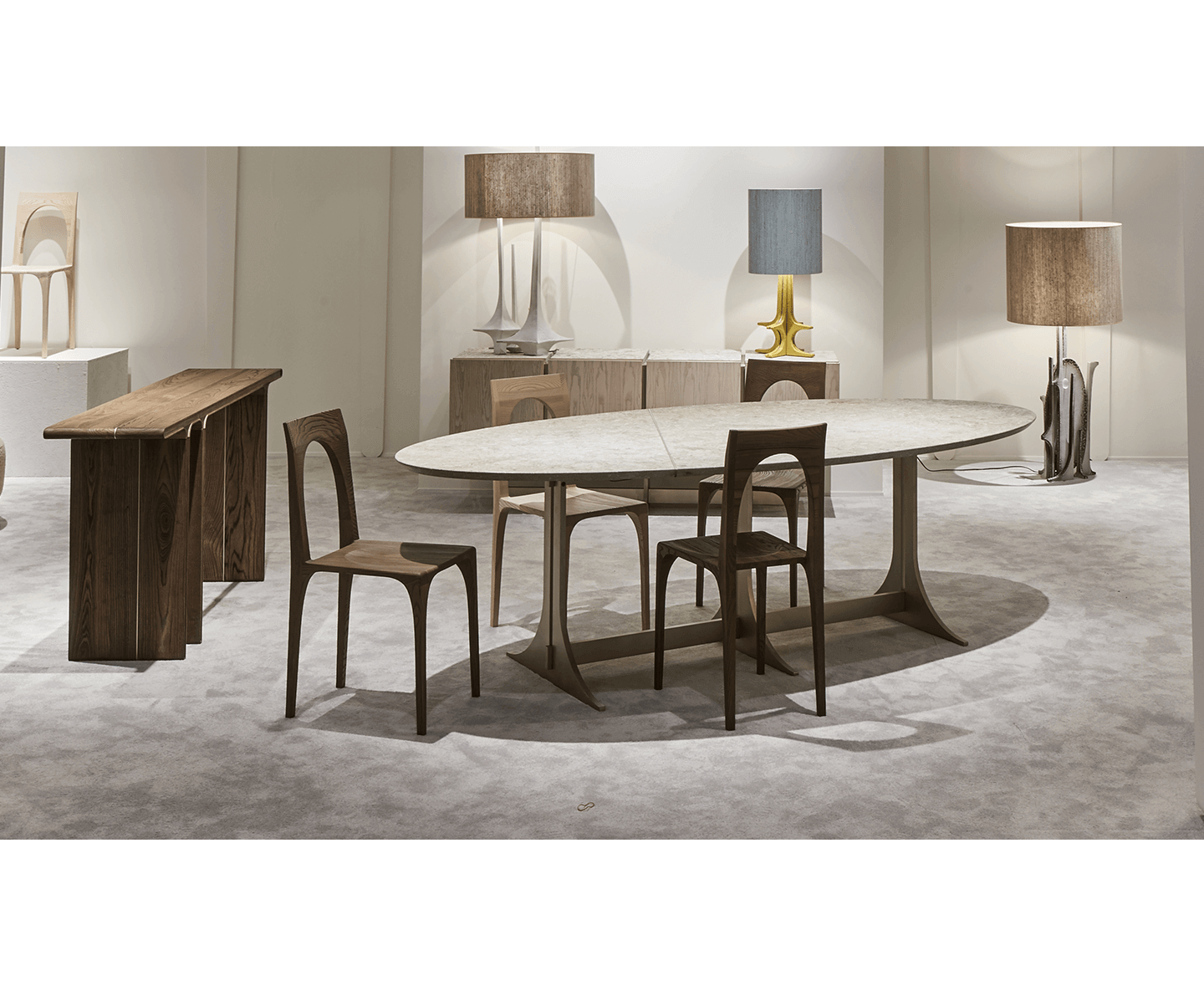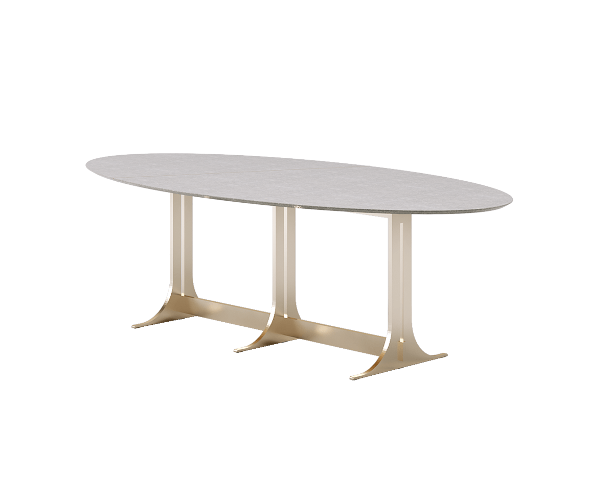 Обеденный стол с металлическим каркасом и отделкой цвета шампанского, с орбитальной сатиновой отделкой. Топ выполнен из светло-серого древнего камня с макрофоссилиями, украшенного матовой металлической вставкой цвета шампанского.