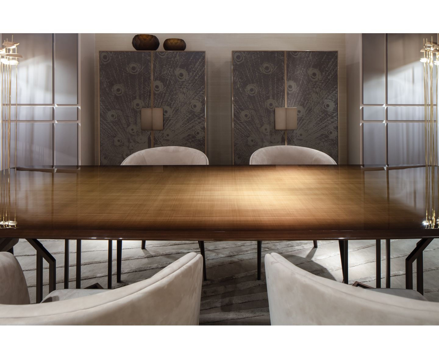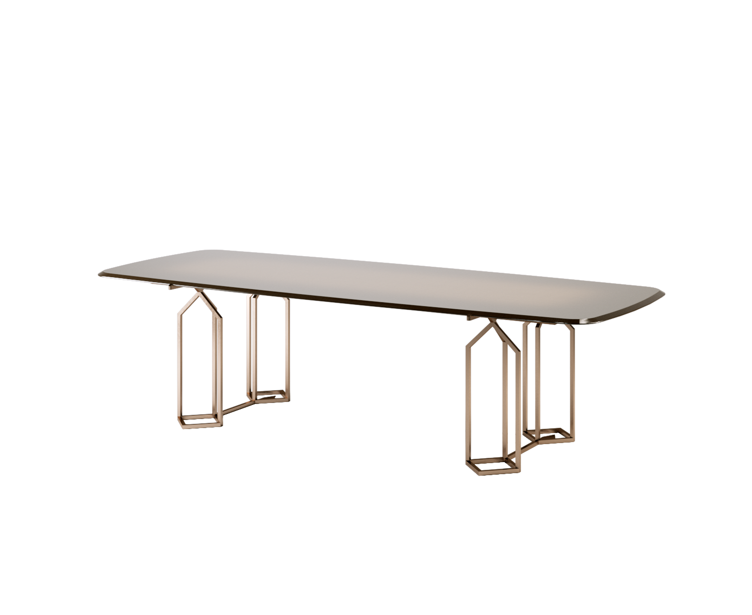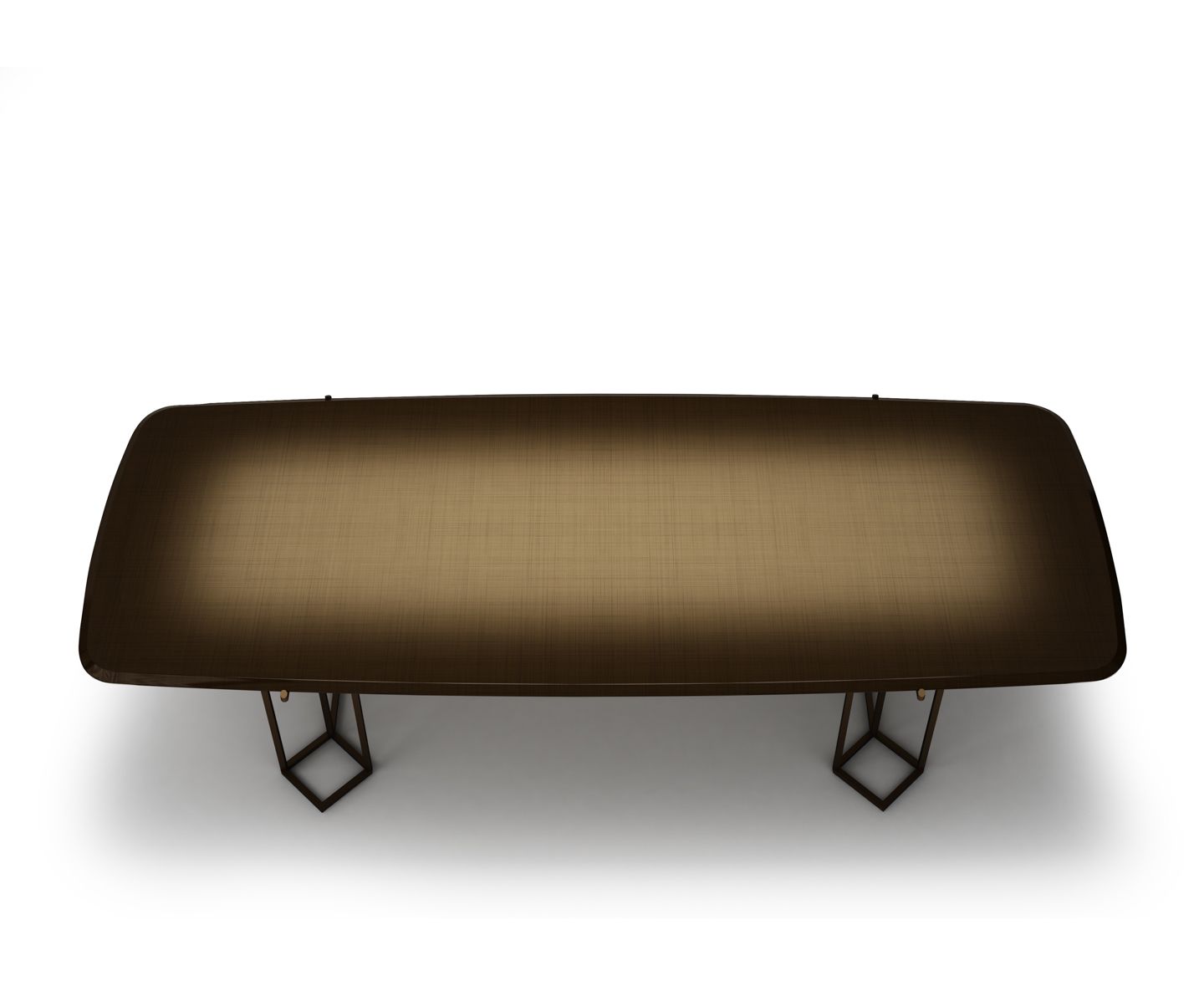 Латинская фраза хорошо подходит к описанию этого обеденного стола, ведь Twelve может вместить до 12 гостей. Стол легкой элегантности и сильного присутствия, находит элемент, характеризующий в несущей конструкции с геометрическими ножками в трубчатом квадратном сечении металла с непрозрачной бронзой теневой гальванической отделкой. Топ с закругленными углами имеет важные размеры и доступен в МДФ (толщиной 2 см) с глянцевым лаком в монохромном варианте или в версии из глянцевого лакированного МДФ, украшенного радиальным градиентом на оттенках обогащенного золота, узором в сафьяно, бронзового цвета.