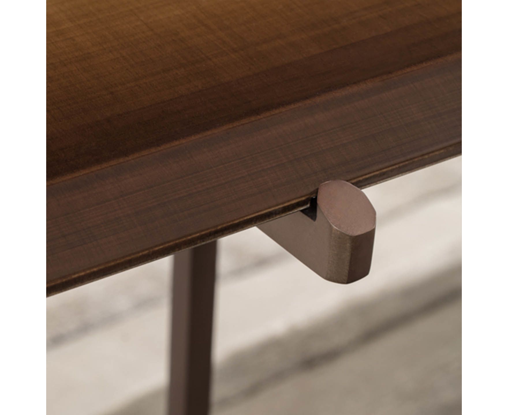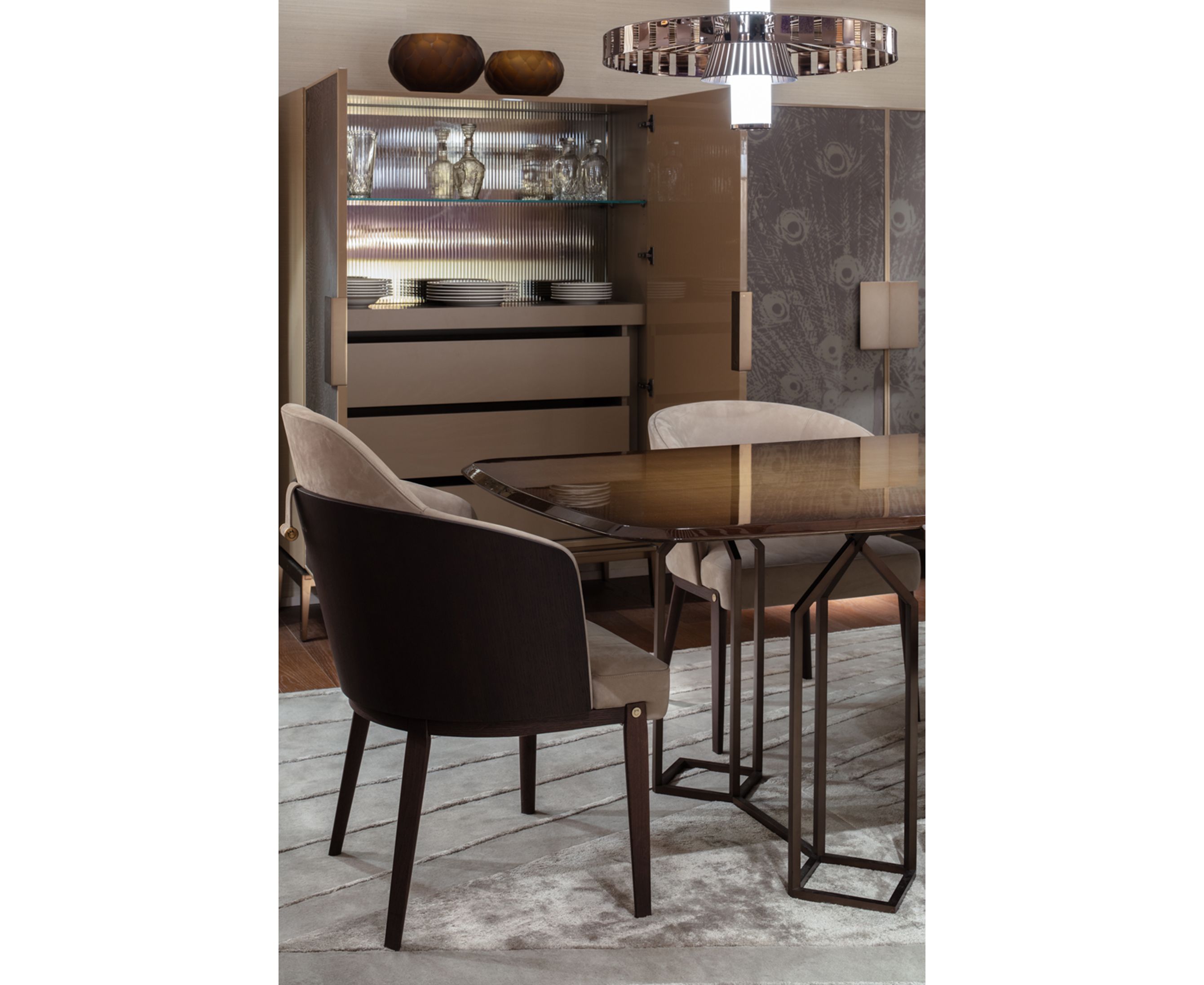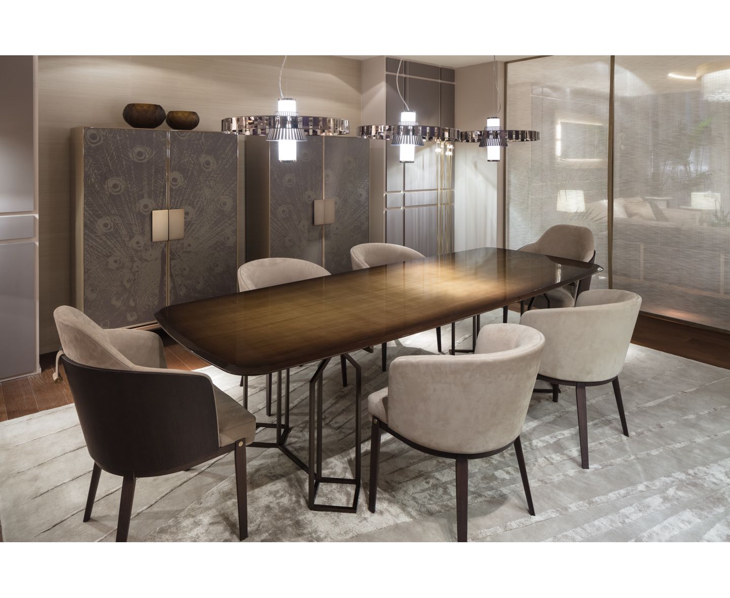 Латинская фраза хорошо подходит к описанию этого обеденного стола, ведь Twelve может вместить до 12 гостей. Стол легкой элегантности и сильного присутствия, находит элемент, характеризующий в несущей конструкции с геометрическими ножками в трубчатом квадратном сечении металла с непрозрачной бронзой теневой гальванической отделкой. Топ с закругленными углами имеет важные размеры и доступен в МДФ (толщиной 2 см) с глянцевым лаком в монохромном варианте или в версии из глянцевого лакированного МДФ, украшенного радиальным градиентом на оттенках обогащенного золота, узором в сафьяно, бронзового цвета.