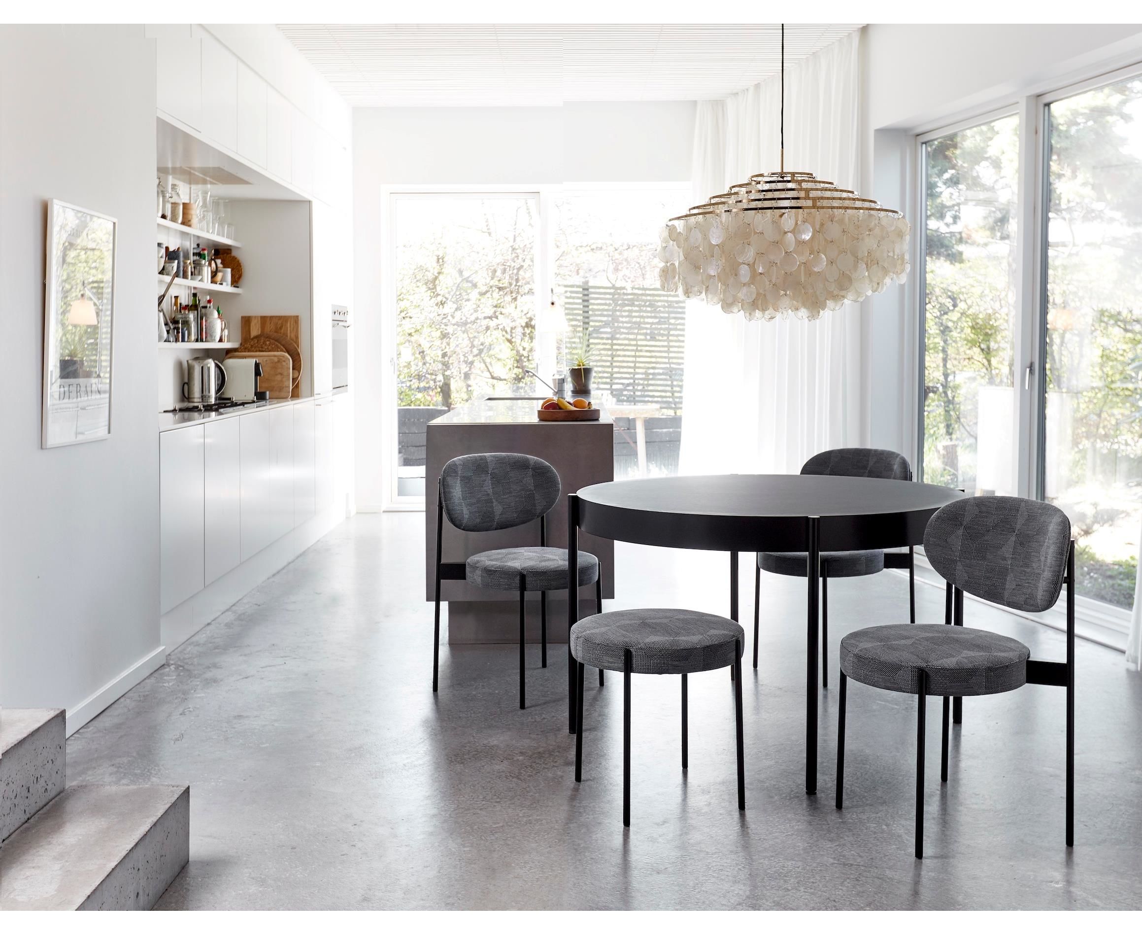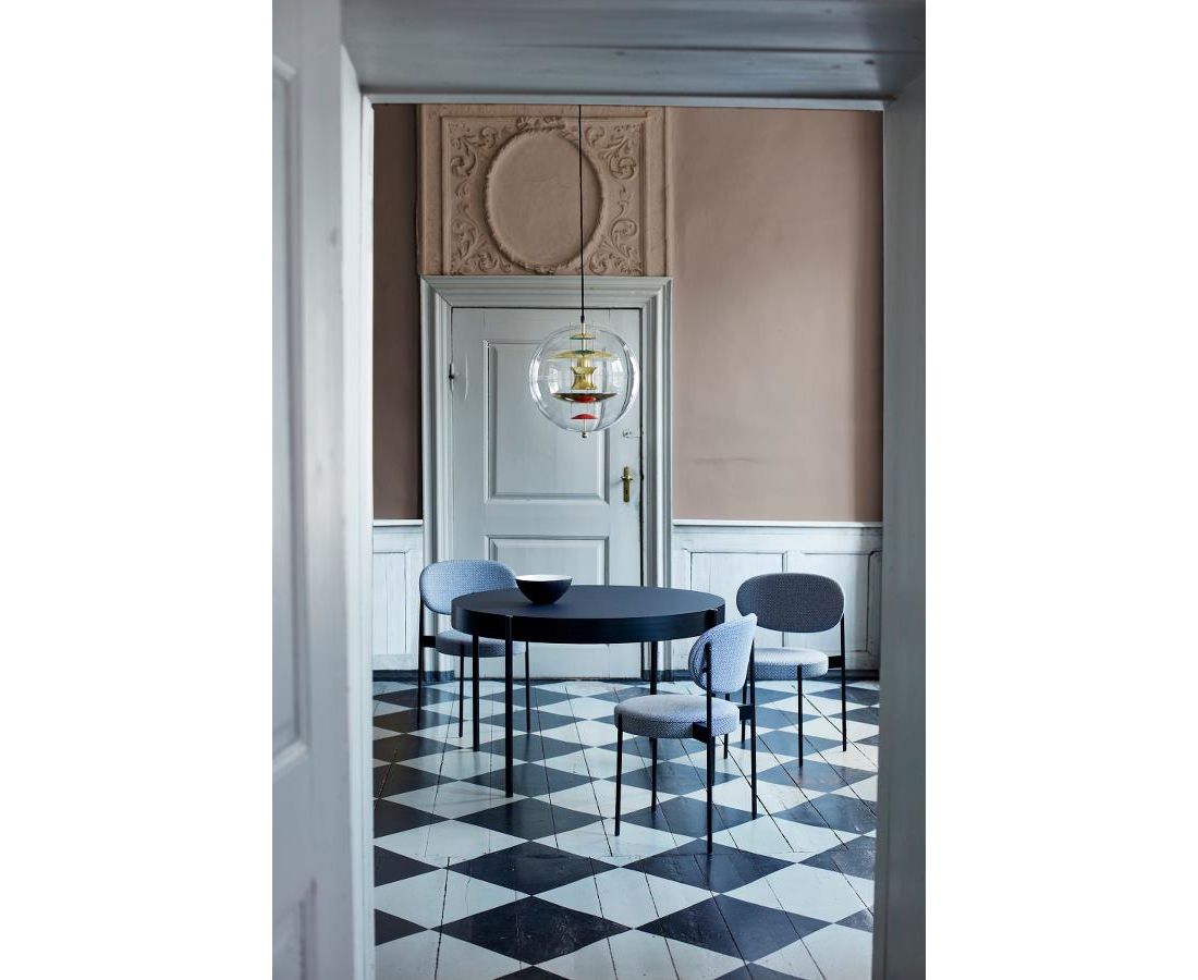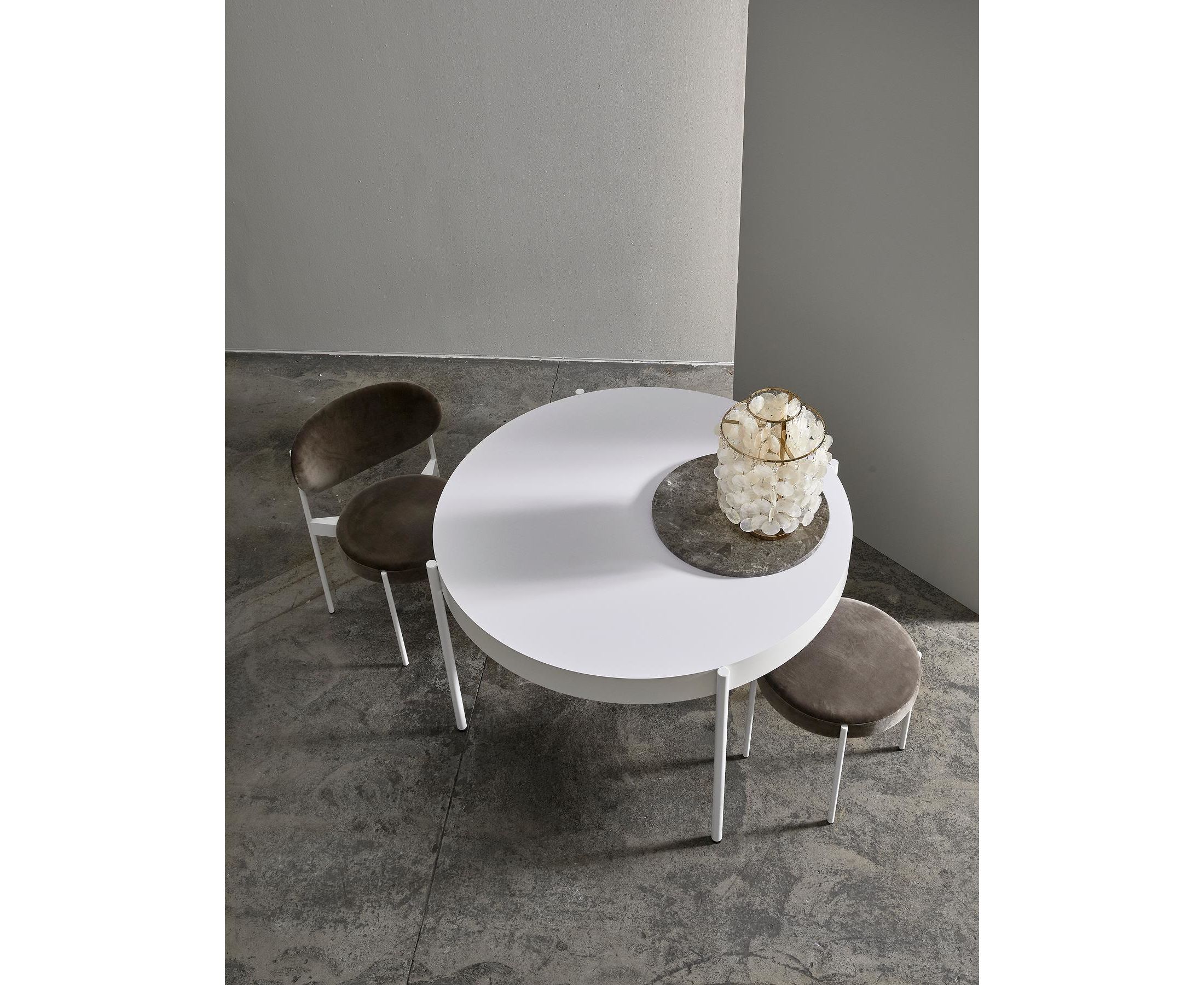 Круглый обеденный стол с очевидной рамой. Ножки размещены за рамкой стола.