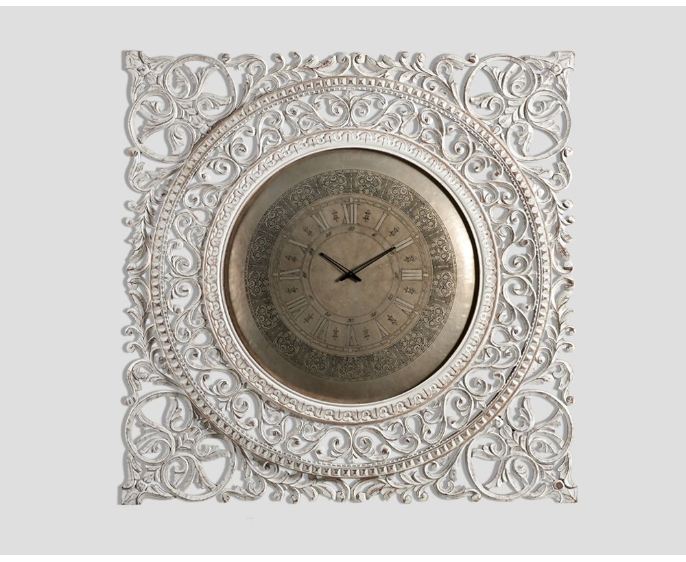 Orologio quadrato da muro, in legno intagliato, finitura laccato Bianco Vissuto, quadrante in metallo finitura Silver