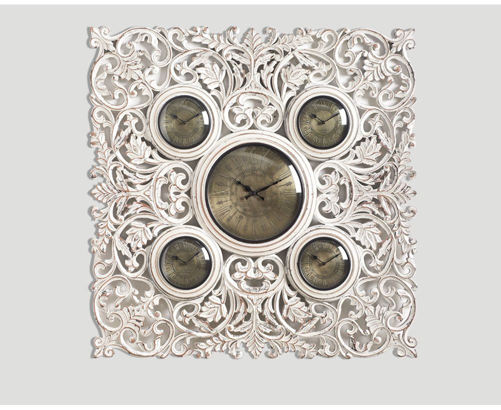 Orologio quadrato da muro 5 quadranti, in legno intagliato, finitura laccato Bianco Vissuto, quadranti in ottone e vetro bombato