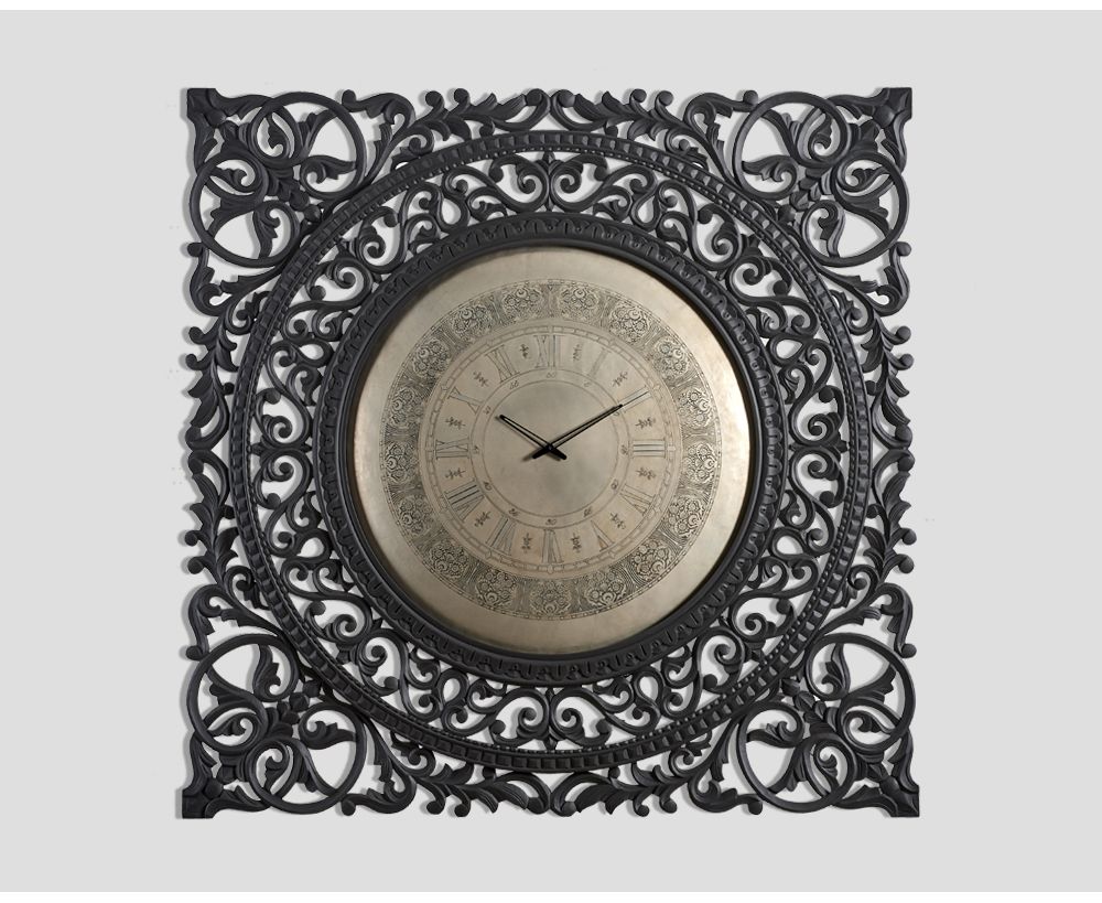 Orologio quadrato da muro, in legno intagliato, finitura laccato e cerato a pennello color Lavagna, quadrante in metallo finitura Silver