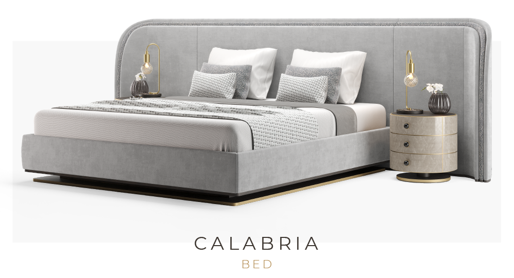 Кровать CALABRIA воплощает концепцию комнаты в комнате, обитое мягкое изголовье этого дизайна создает мирное убежище во сне, вмещая в себя не только кровать, невысокую от пола, но и две тумбочки.