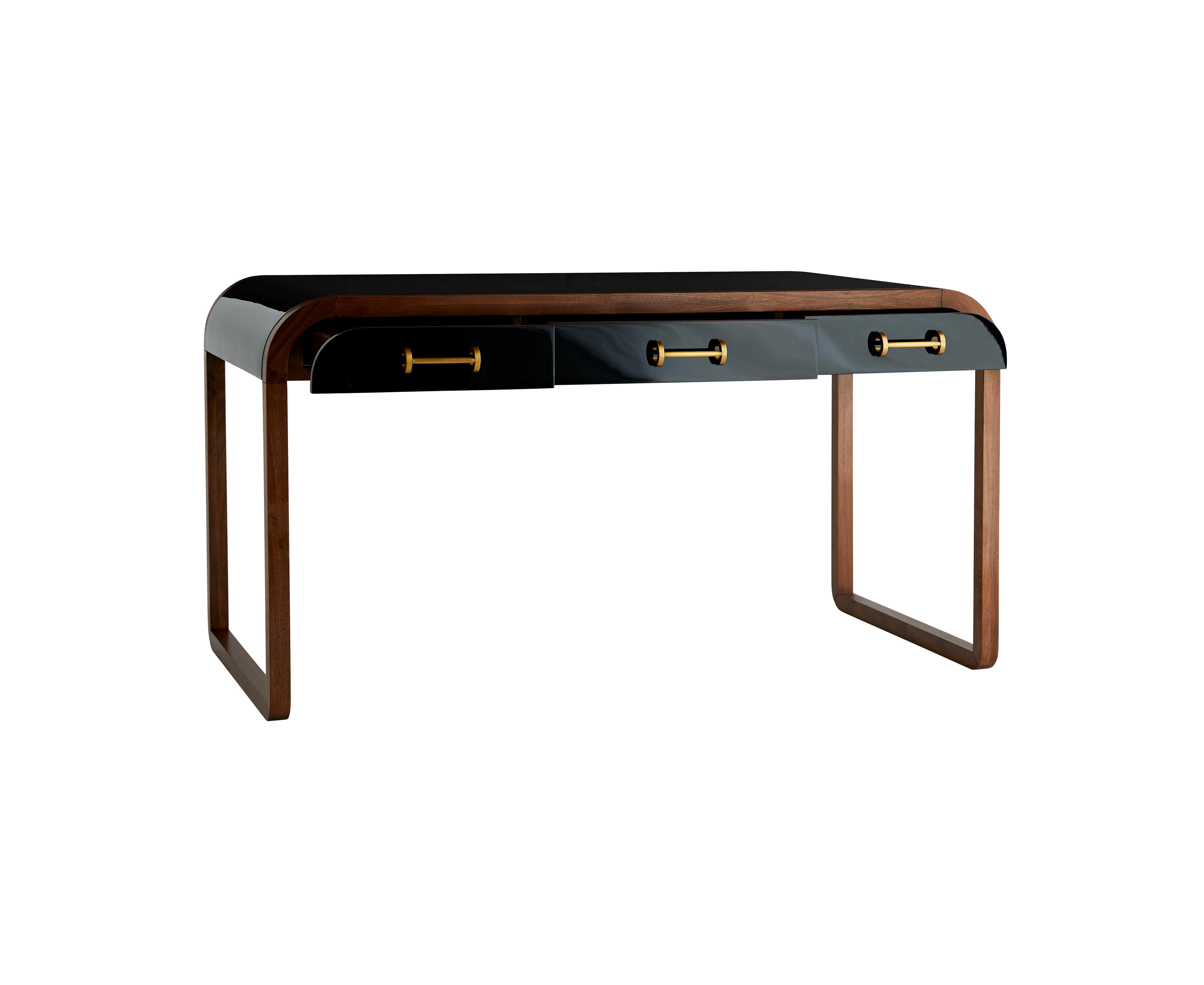 Этот миниатюрный письменный стол излучает великолепный баланс формы и функциональности. Бесшовная кривизна твердой рамы из ореха плавно обтекает верхнюю часть стола, создавая целостный и обтекаемый вид. Контраст черных лаковых и сатиновых оттенков грецкого ореха вместе с антикварной медной фурнитурой привлекает внимание к его тонкому профилю. Особенности: три функциональных ящика для хранения.