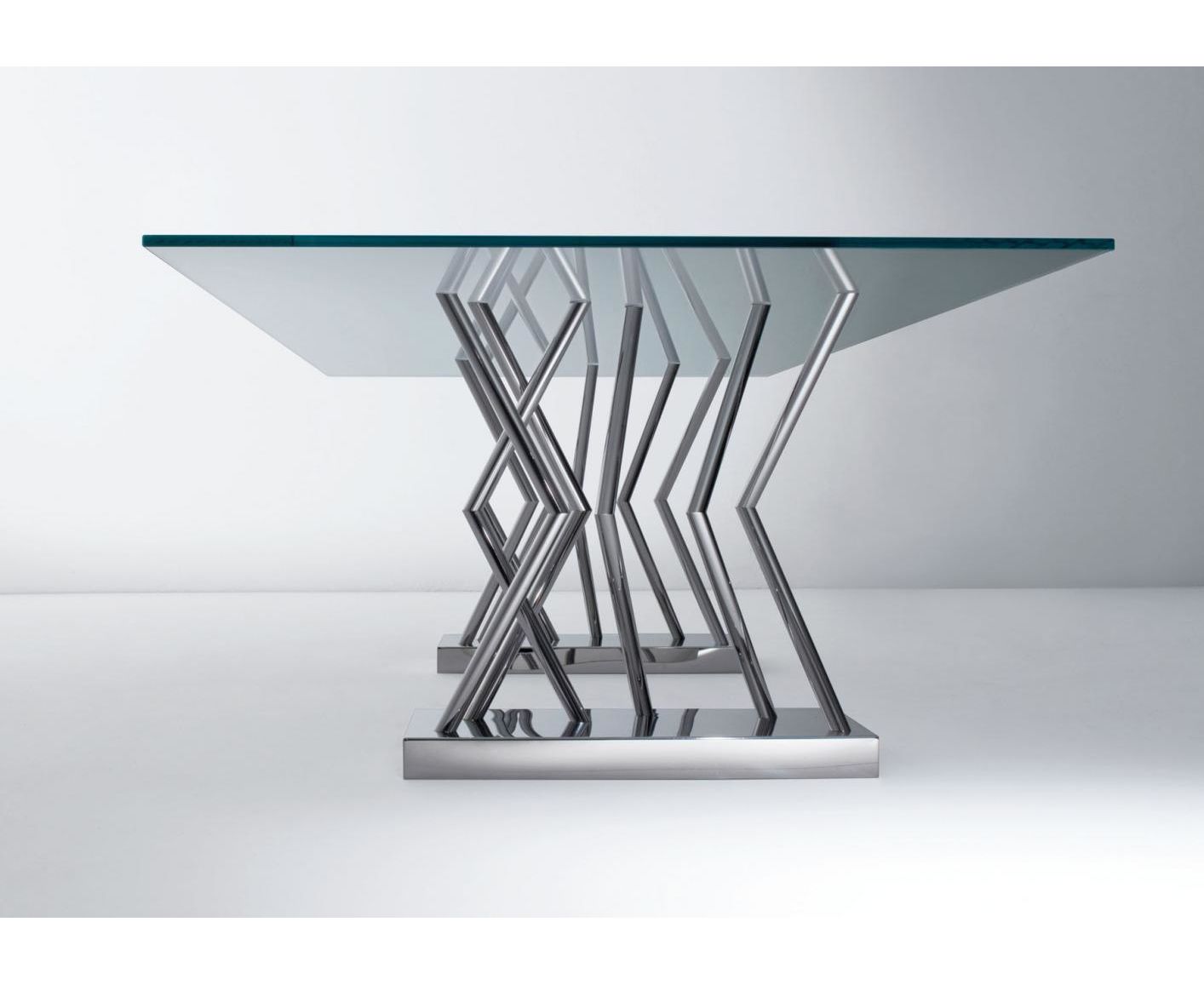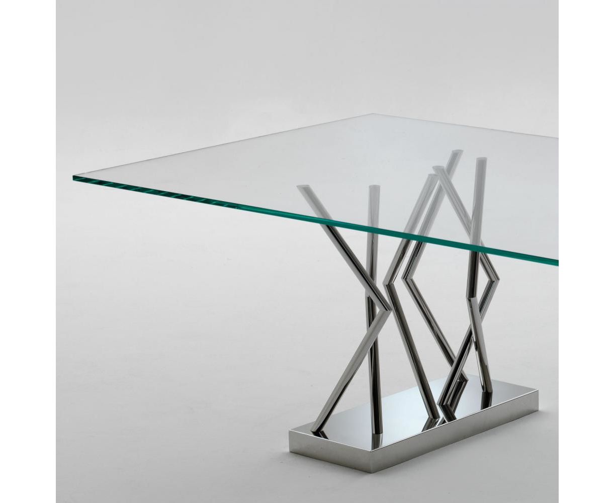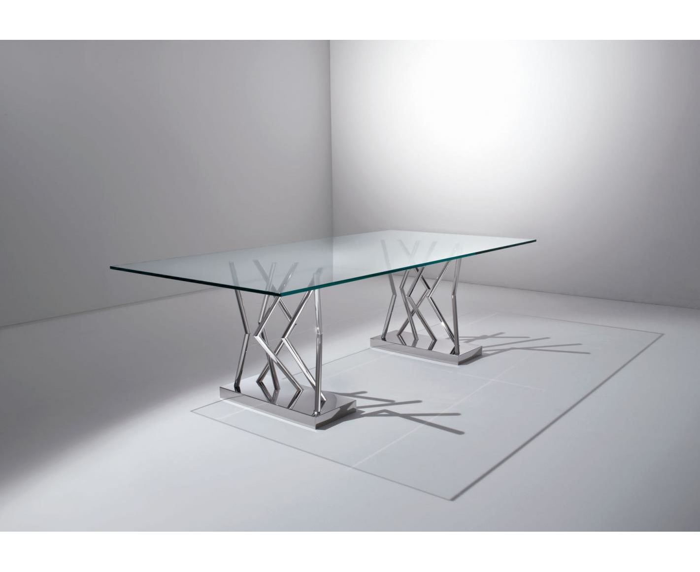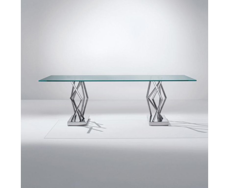 SA 07 – это стол с основанием и конструкцией из блестящей стали и столешницей из очень светлого хрустального стекла. Благодаря комбинации стали и хрустального стекла, а также оргинальному выбору основания со множеством пересекающихся в различных точках ножек, этот стол является уникальным и современным решением, идеальным для новейших офисов.