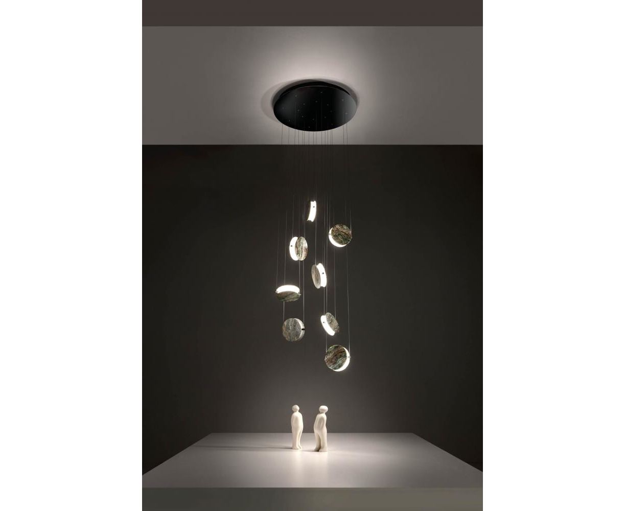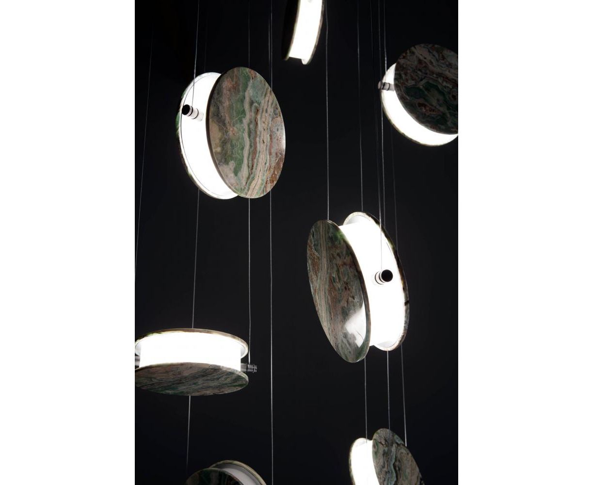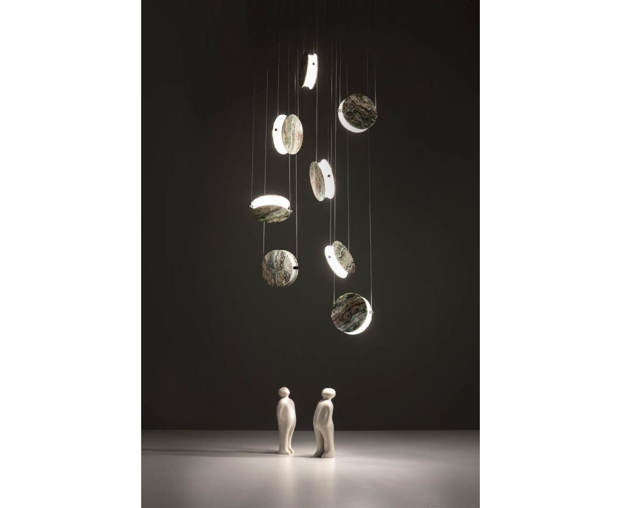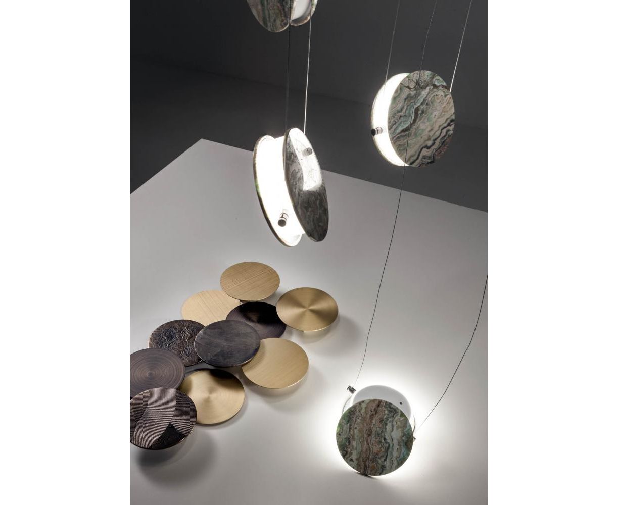 Подвесные светильники со сменными магнитными дисками. CLIS – это система миниатюрных украшений-ламп в форме дисков, поддерживаемых тонкими проводами. Возможное расположение ламп: одиночное, линейное, нескольких вместе, каскадом, дает широкие возможности для персонализации с целью получения оригинальных источников света. Взаимозаменяемые магнитные диски из латуни или бронзы, с фактурной текстурой или дорогим многоцветным мрамором украшают изделие. Светильники регулируются как по вертикальной, так и по горизонтальной оси, чтобы лучше распространять свет или создавать декоративные световые эффекты.
