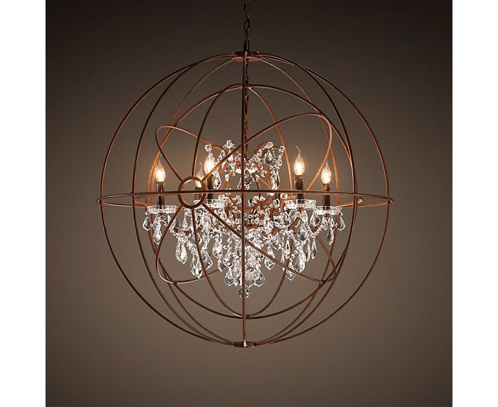 Подвесной светильник Foucault's Twin-Orb Crystal Chandelier Rustic Iron фабрики Restoration Hardware. Модель выполнена в виде ажурного шара имитирующего вращение земли. Внутренняя часть люстры состоит из стальных изогнутых трубочек, украшенных сверкающими бусинами и каплями из хрусталя и стекла.