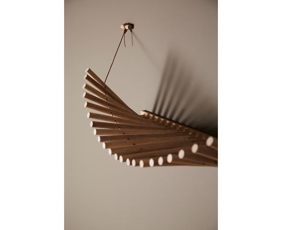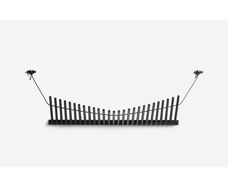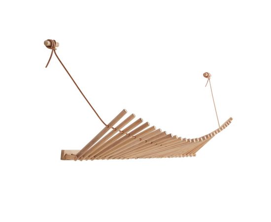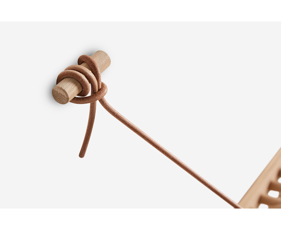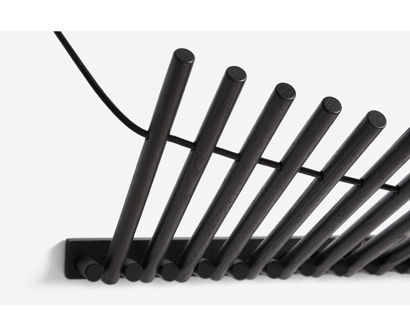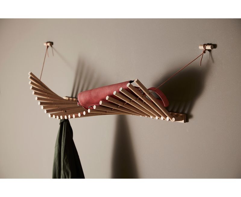 Knaegt - это вешалка для верхней одежды и полка для шляп в сочетании с элегантной эстетикой. Простое повторение деревянных палочек с проходящим через них кожаным шнуром делает вешалку динамичной, так как линия, создаваемая палочками, меняется в зависимости от того, что висит на вешалке. Каждая палка действует как вешалка. Разработанный талантливым дизайнером Рикке Палмерстоном, с целью обеспечения экологической устойчивости, Knaegt упакован в плоскую упаковку для легкой транспортировки и изготовлен без необходимости использования передовых технологий. Вешалка для пальто современна по своему выражению, но яркая кожа - это то, что придает Knaegt свой характер.