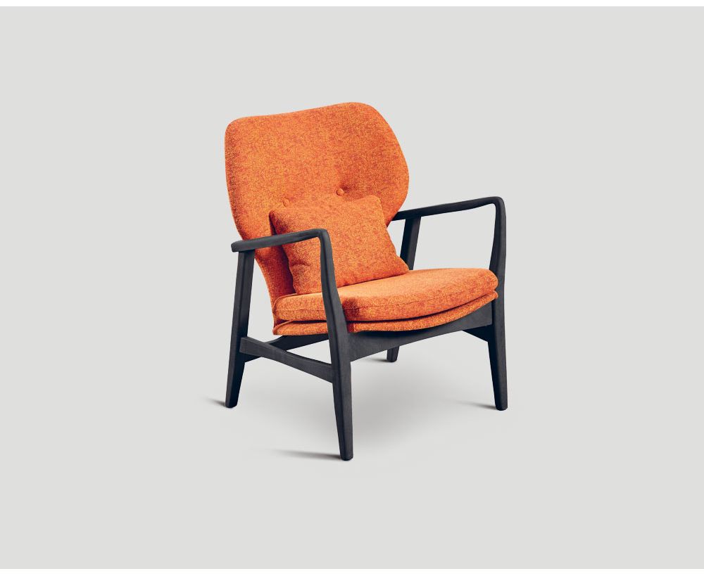Poltroncina con struttura in faggio finitura legno Vintage con sedile, schienale e cuscino in tessuto, tessuto color Ambra