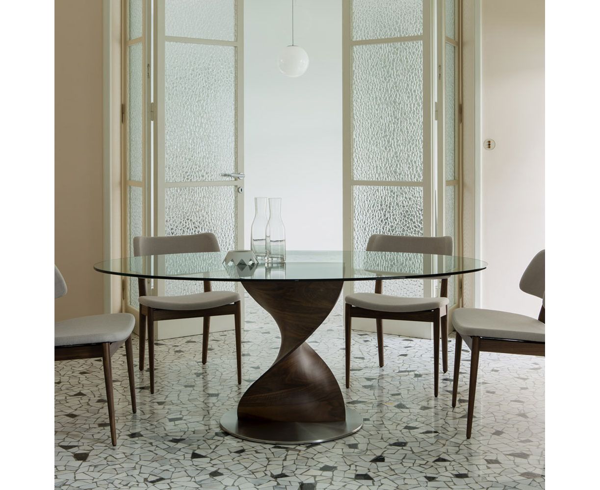 Обеденный стол на шесть персон, выполненный в современном стиле. Модель отлично подойдет для любого интерьера. Круглая столешница выполнена из прозрачного прочного закаленного стекла толщиной 12 мм. Особое внимание привлекает центральная ножки - они будто закручена, сделана из массива ореха или ясеня.