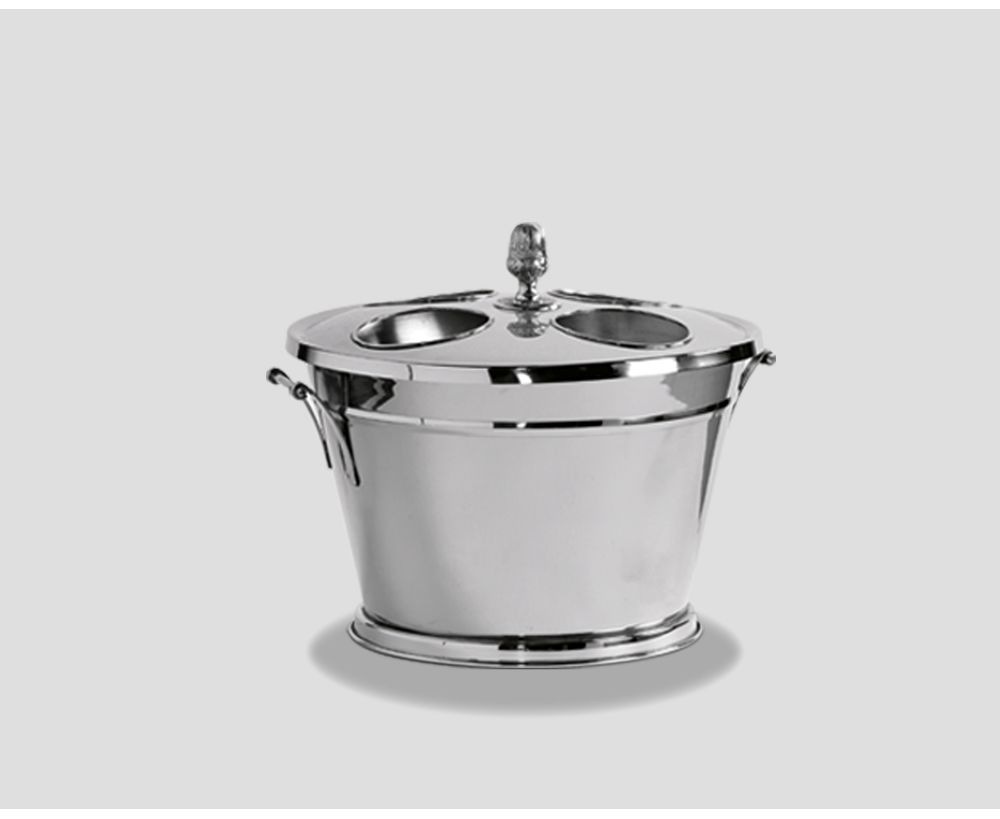 Porta champagne con coperchio removibile, in metallo finitura nichel lucido.