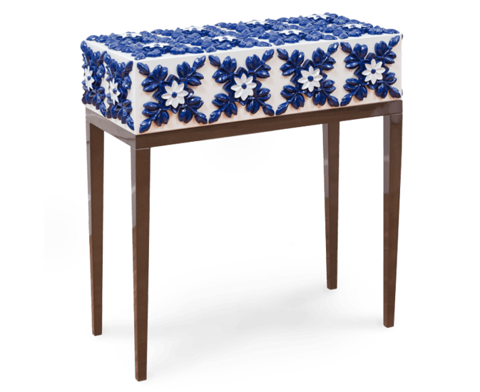 Основа из лакированного дерева, верх из сатинированного дерева и расписанная вручную плитка