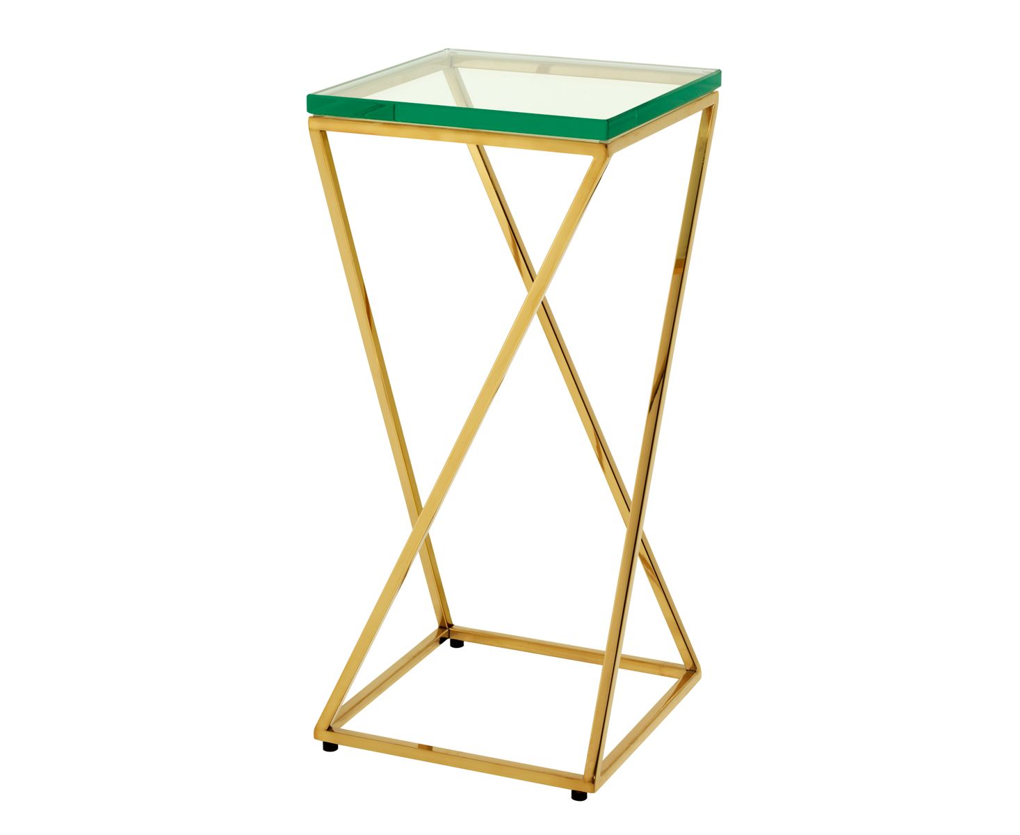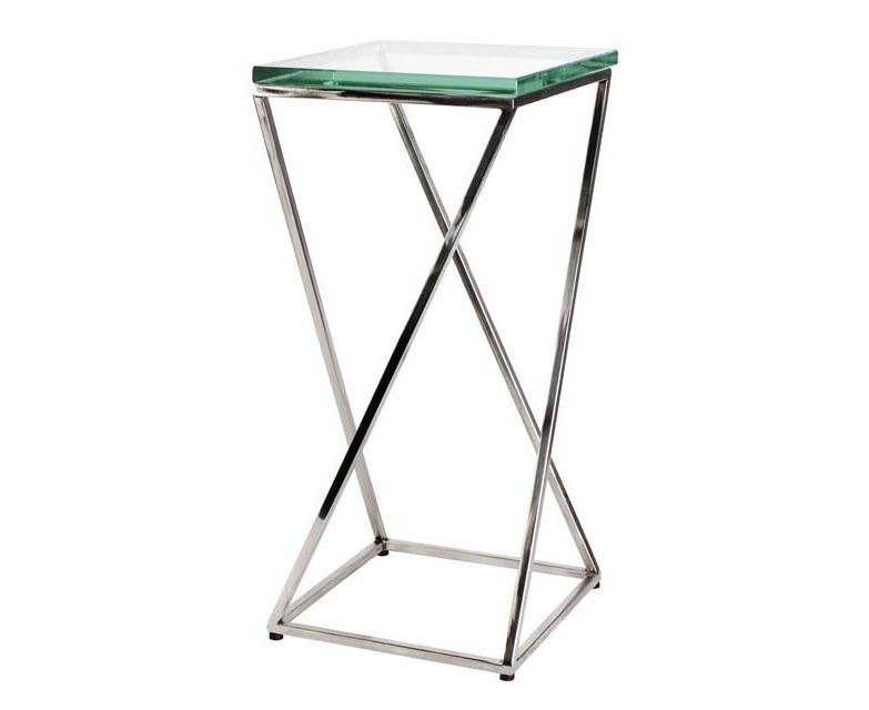 Приставной столик из стекла и металла. Тонкие ножки составляют всю конструкцию, идя на перекрещивание, создается впечатление движения. Подчеркнуто толстая столешница из прозрачного стекла.